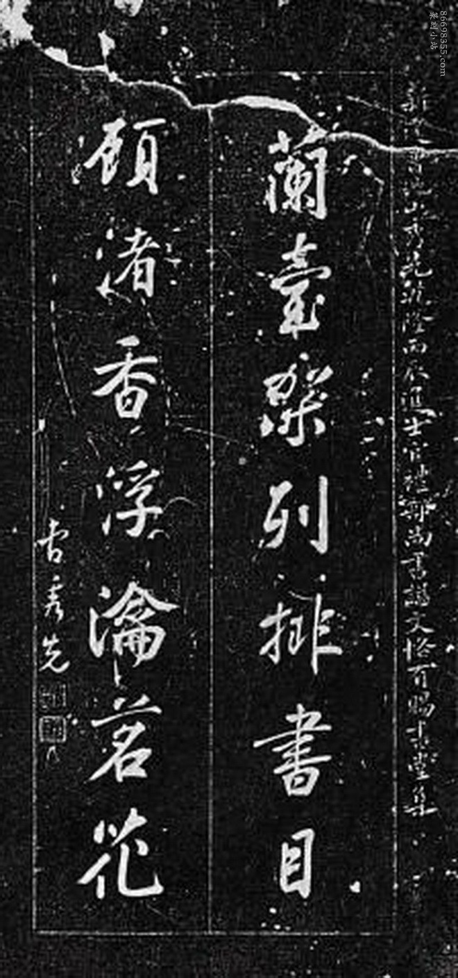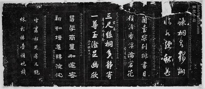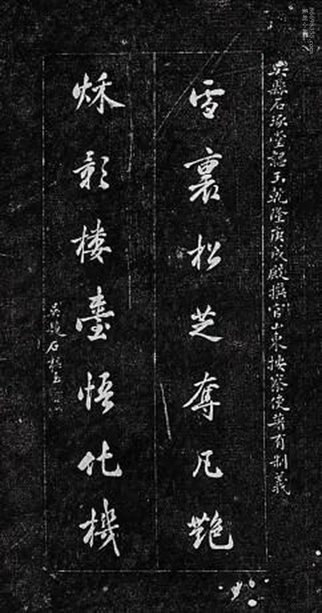 碑石:该碑碑文刻楹联五副,第一联是刘统勋的草书,第二联是曹秀先的行书,第三联是钱维城的行书,第四联是万经的隶书,最后是石韫玉的行书。