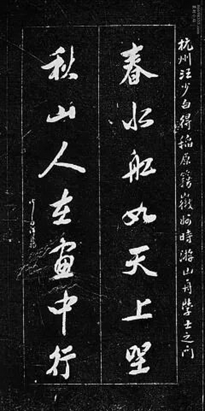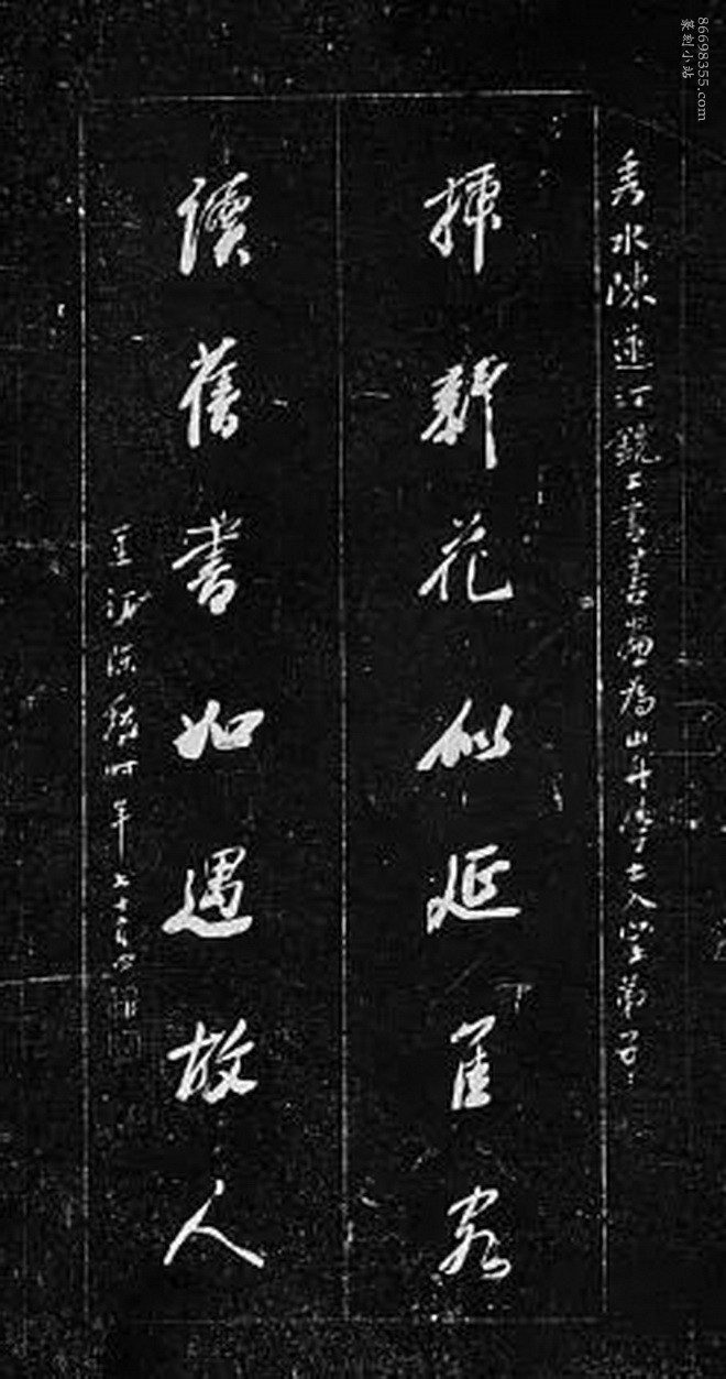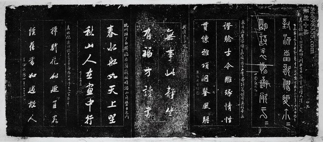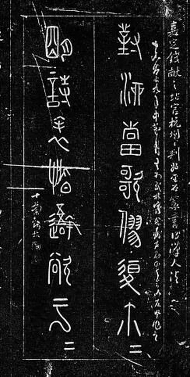 碑石:该碑碑文有楹联五副,从右至左,第一联是钱坫的篆书,第二联是屠倬的行书,第三联碑面损坏严重,第四联是汪得稻的行书,最后是陈铣的行书。(此次对第三联不作解析)