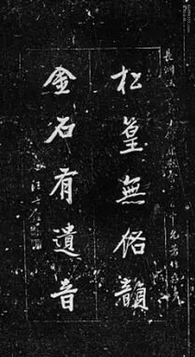 【解析】“篁”,即竹。“金石”,常用以比喻诗文音调铿锵、文辞优美。“遗音”,指不绝之余音,形容音乐或诗歌极其美好。上联谓此处遍植松竹,景致不俗;下联谓诗文音调铿锵、文辞优美,吟之余音不绝。