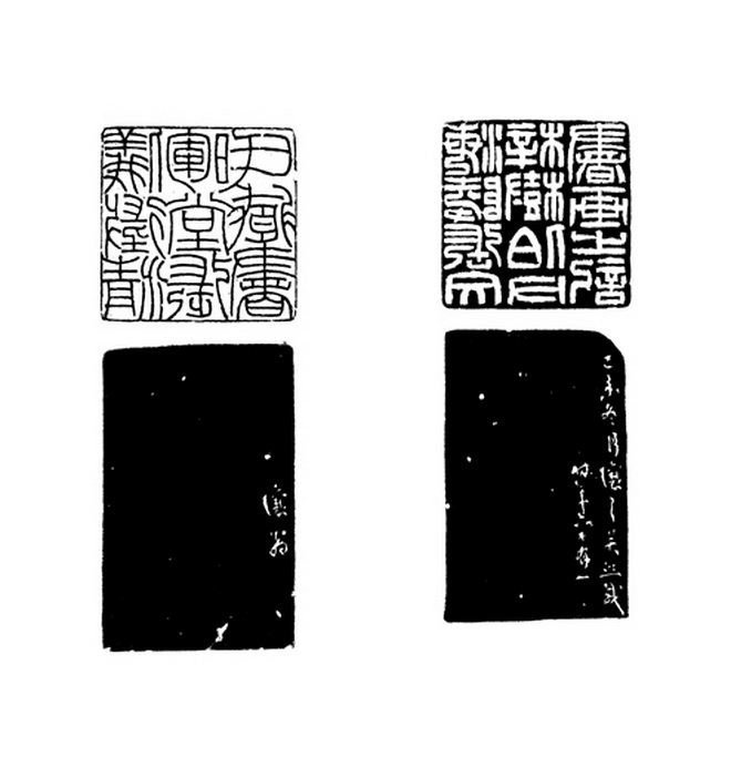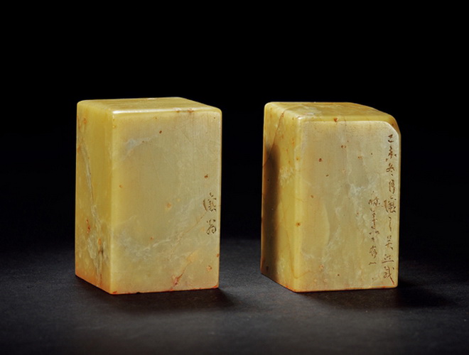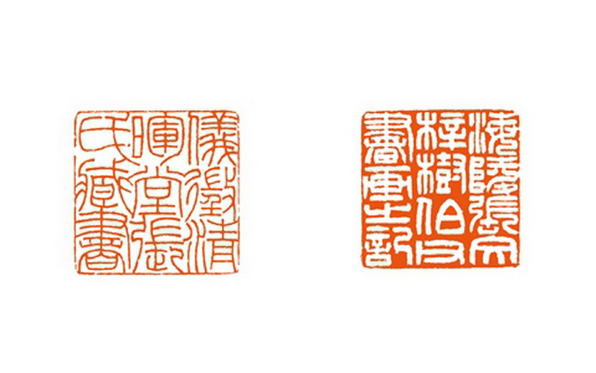 1859年作,清吴让之刻青田石张树伯自用对章,印文:仪征清晖堂张氏藏书,海陵张文梓树伯父书画之记; 西泠印社2019年秋季拍卖会,同源异流·流派印风名家篆刻专场,成交价格299万,吴待秋旧藏。
