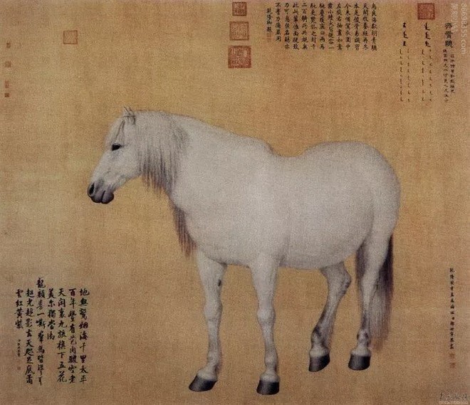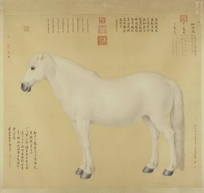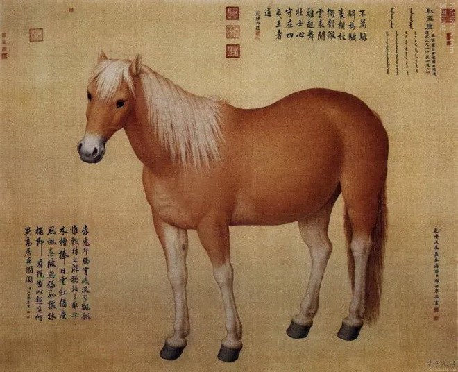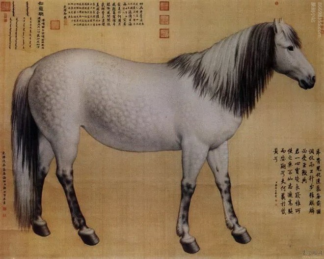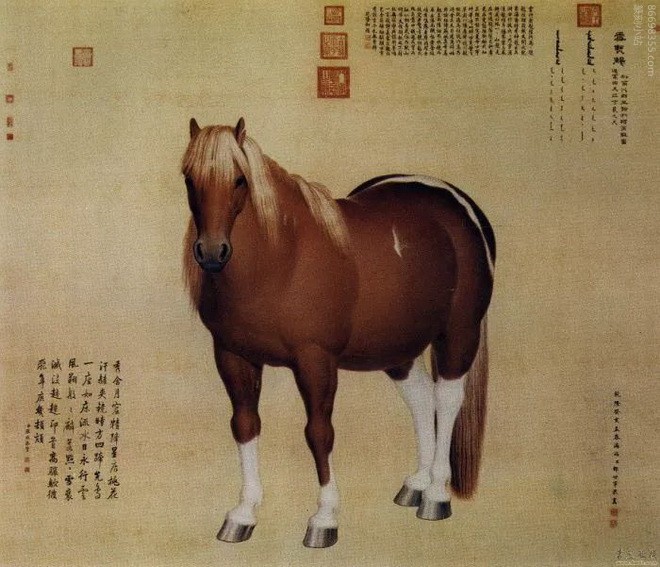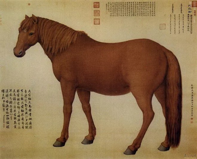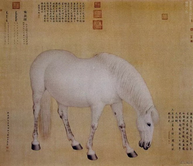 郎世宁所画的两份《十骏图》:一份载于《石渠宝笈初编》,收贮于御书房,由郎世宁一人所画,十幅十马分别命名为奔霄骢、赤花鹰、雪点雕、霹雳骧、薾云驶、万吉骦、阚虎骝、狮子玉、自在驈、英骥子。