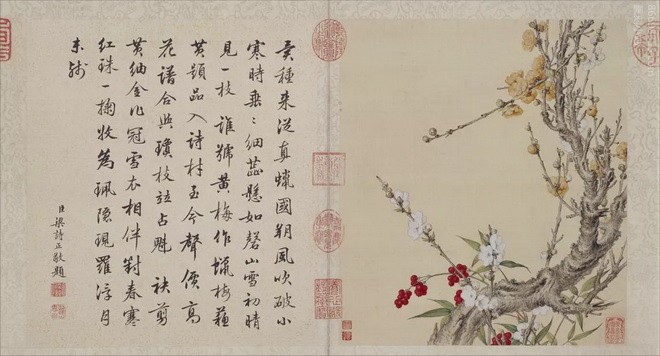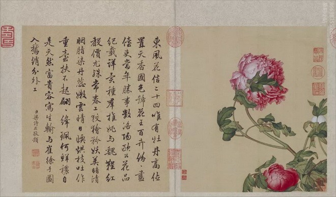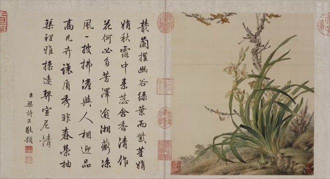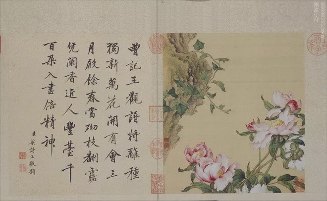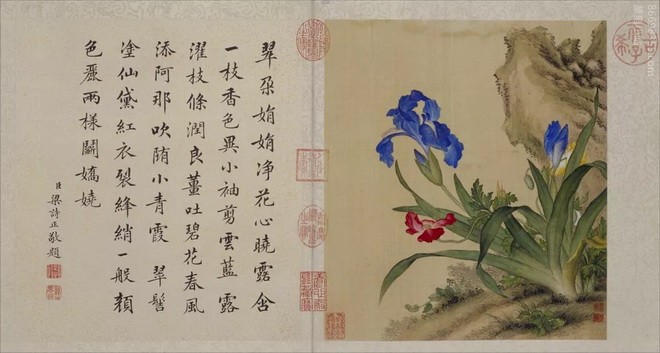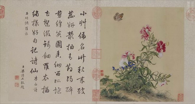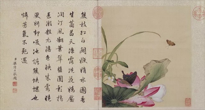 此图册分别描绘了牡丹、兰花、罂粟、萱草、荷花、梅花等艳丽多姿的花卉和体态生动的蝶、鸟。构图上取法中国传统花鸟画的格局,以虚托实,注重对所绘物象的突出。在表现技法上,则充分发挥了欧洲绘画注重明暗及透视的特点,以工致细腻的笔触,刻画出花瓣、叶片以及鸟雀的羽毛质感和体积感,呈现出与传统的中国花鸟画迥然不同的艺术风貌。这种“中西合璧”的画风成为清代宫廷绘画艺术的一大特色,受到了清皇室的青睐。