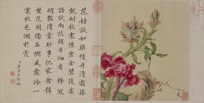 款署:“臣郎世宁敬画”,下钤“郎世宁”朱文印、“写生”白文印。每开均有钤“郎世宁”、“写生”印。鉴藏玺印有:“乐寿堂读书记”、“古希天子”、“乾隆御览之宝”、“八徵耄念之宝”、“嘉庆御览之宝”、“养心殿鉴藏宝”等。每开均有乾隆朝内阁大臣梁诗正的题诗。