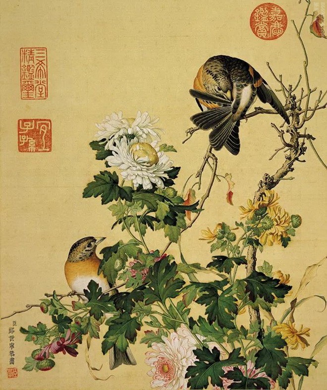 郎世宁的「仙萼长春图册」共含16幅图画,现藏于台北故宫博物院。分四时花卉,各幅间并缀以巨石、翎毛、小草,为融合中西画法的难得杰作,每幅均宽28.4公分,高33.7公分。16幅为:牡丹、桃花、芍药、海棠与玉兰、虞美人与蝴蝶花、黄刺么与鱼儿牡丹、石竹、樱桃、罂粟、紫白丁香、缠枝牡丹、翠竹牵牛、荷花与慈姑花、豆花、鸡冠花、菊花。
