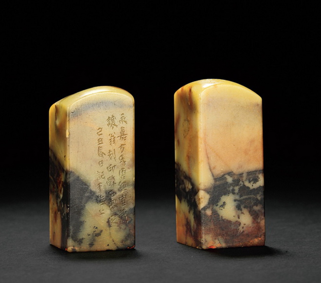 清吴让之刻凌毓瑞自用青田石对章,印文:凌毓瑞印,东笙;印面尺寸2.5×2.5厘米,高5.7厘米,5.9厘米,西泠印社2013秋季拍卖会,文房清玩近现代名家篆刻专场,成交价格126.5万。