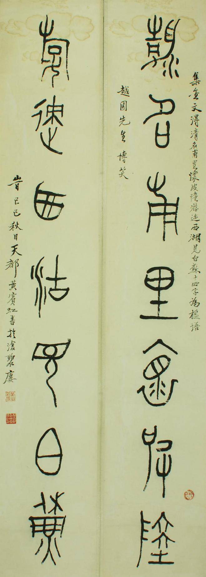 款识:“集金文得‘清名甫里怀皮陆,游迹西湖见白苏’十四字为楹语。越园先生博笑。时己巳秋日,天都黄宾虹书于沧碧楼。”