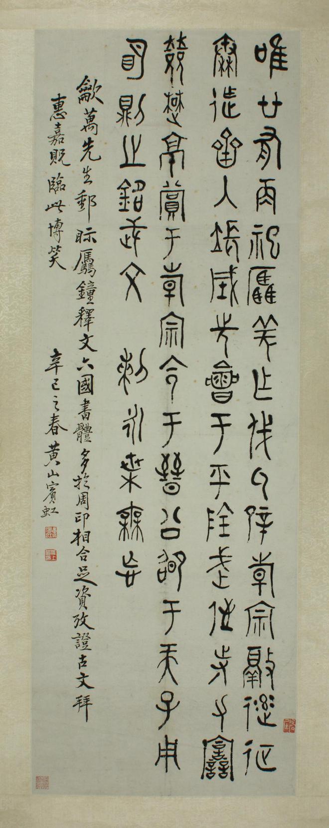 款识:“释文:繁花院画有参错,散木匠门无弃遗。辛卯八十八叟宾虹集古籀文撰书。”