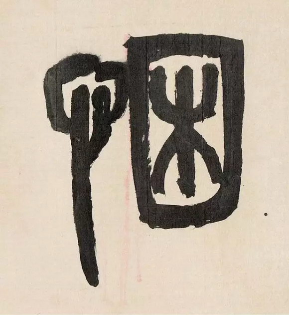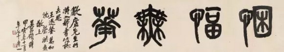 吴昌硕的篆书,甚得益于《石鼓文》的反复研习。其在六十五岁时自记:“余学篆好临《石鼓》,数十载从事于此,一日有一日之境界。”中晚年后,吴昌硕临写《石鼓》渐渐“离”形而传神,参以隶书,楷书以致草书的笔法倾向愈加明显。而其书写的小篆,也大有“任情恣性”之感,逐渐形成了此幅作品在这种特有的美学特征。