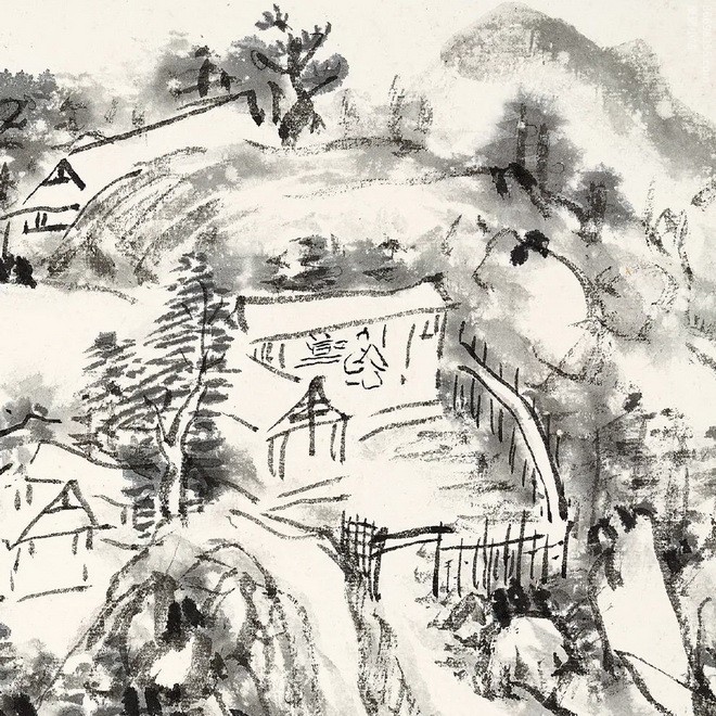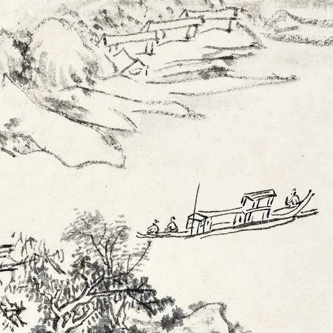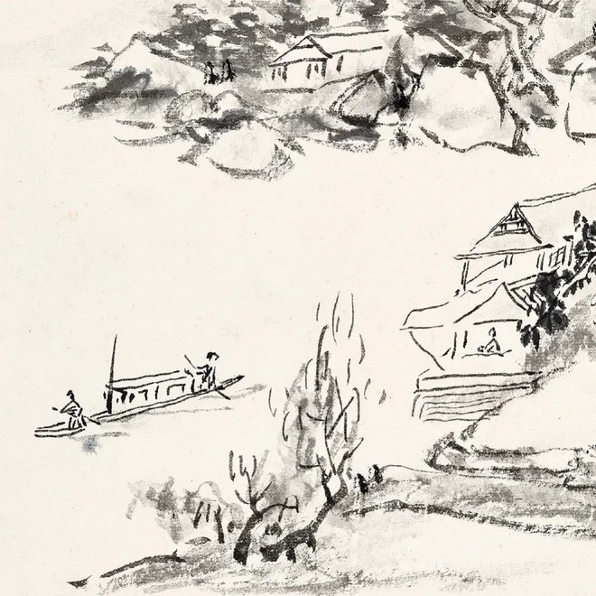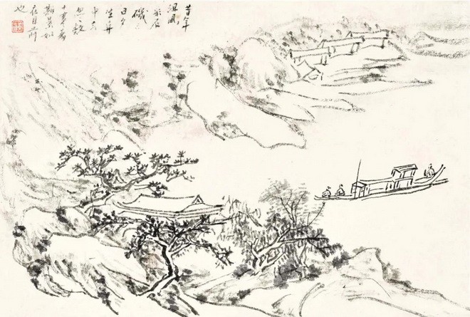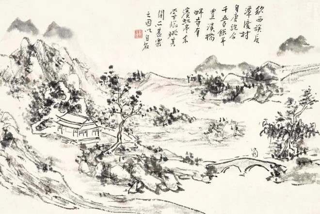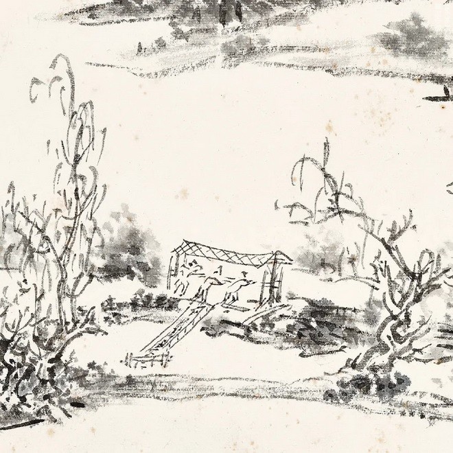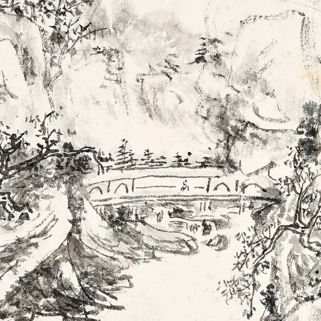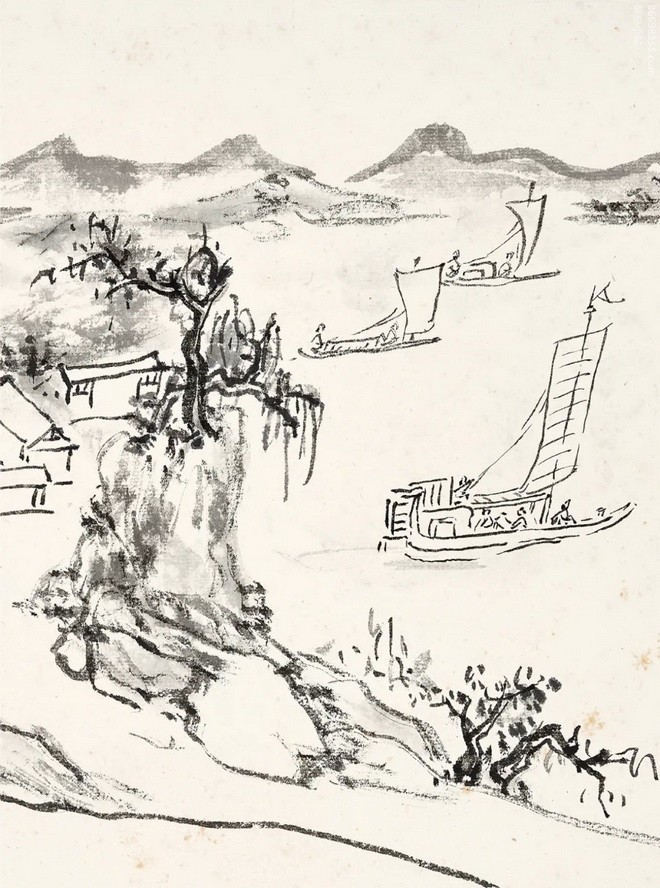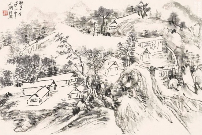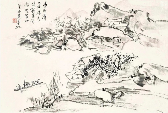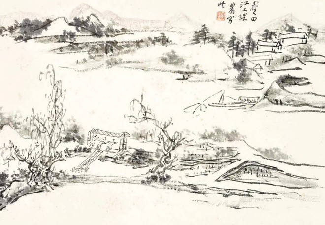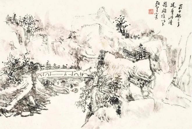 观赏宾虹老的写生册,会发现他就是一位深谙“卧游”之法的老法师。从族居之地的“滨虹亭”,到当年为风所阻而停宿江上“采石矶”,还有在镇江访寻米芾海岳楼遗迹时日夕听帆江上,乃至游历浙江金华山中三洞,直至他畅游蜀地而得之廊桥,间杂着江上风光和农田之景。整本册页以水墨绘就,远山淡笔虚写,近景略为渲染,点擦互皴,笔墨交替,可谓从心所欲,却画得法备气华。
