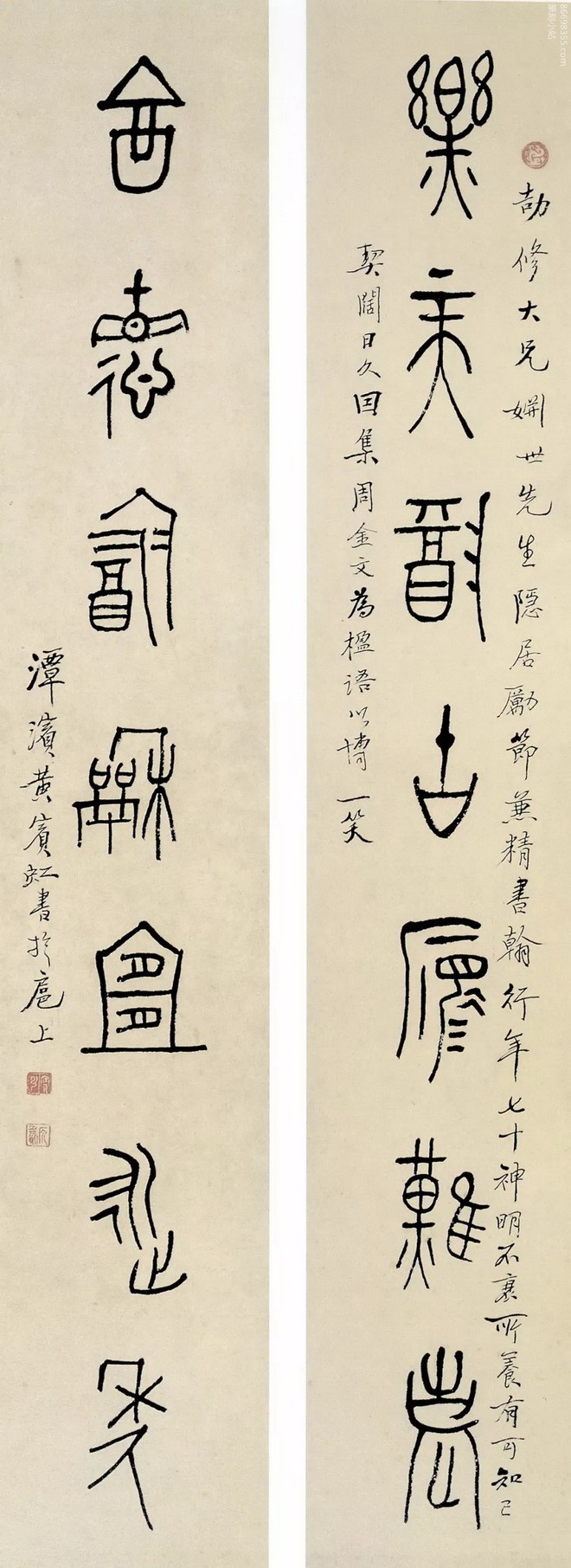 释文:乐天尊古应难老 吉德饮和宜永年 劼修大兄姻世先生隐居励节 兼精书韩行年七十 神明不衰 所养有可知 契阔日久 因集周金文为楹语以博一笑 潭滨黄宾虹书于沪上
