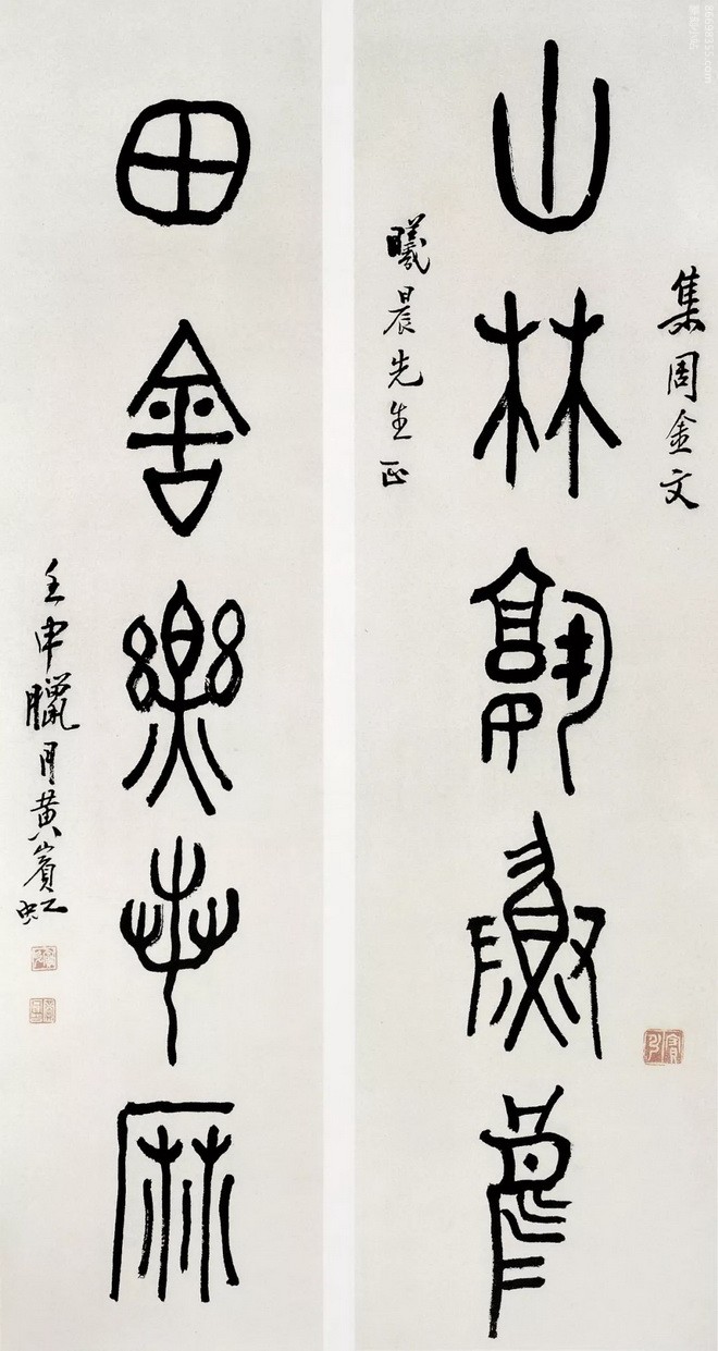 释文:山林熟鱼鸟 田舍乐桑麻 集周金文 曦晨先生正 壬申腊月 黄宾虹
