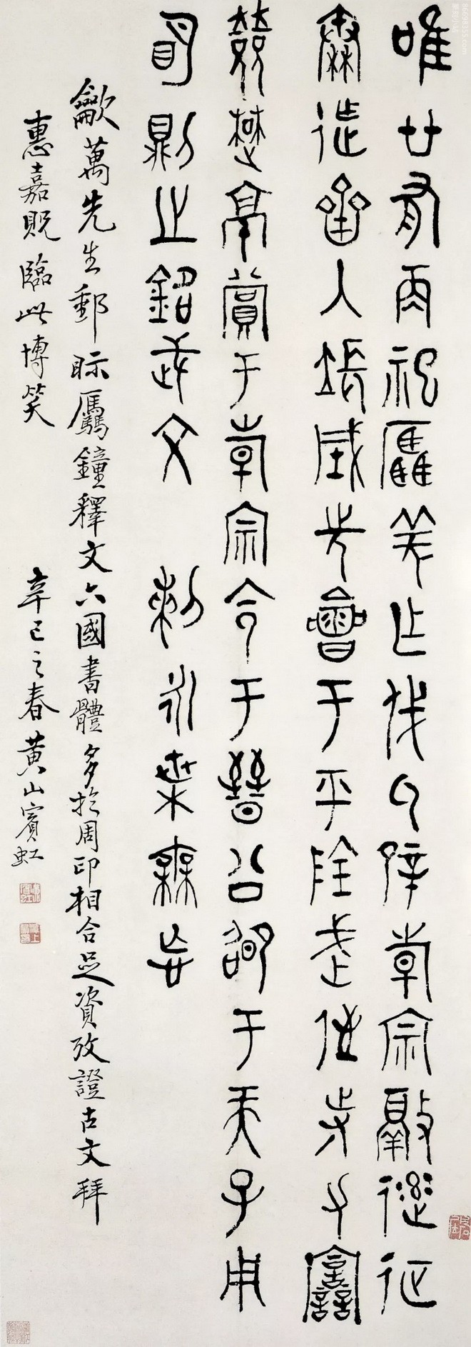 释文:唯廿有祀 口 羌作伐氒辟韩宗 口 率征 秦迮奇齐入 口城 先会于平阴 武侄(寺)侍力 口 口 楚京 赏于韩宗令于晋公邵于天子 用明则之铭 武文 □ 刺永枼无忘 吹万先生邮视 口 钟释文 六国书体多于周印相合 足资考证古文 拜惠嘉贶临此博笑 辛巳之春 黄山宾虹