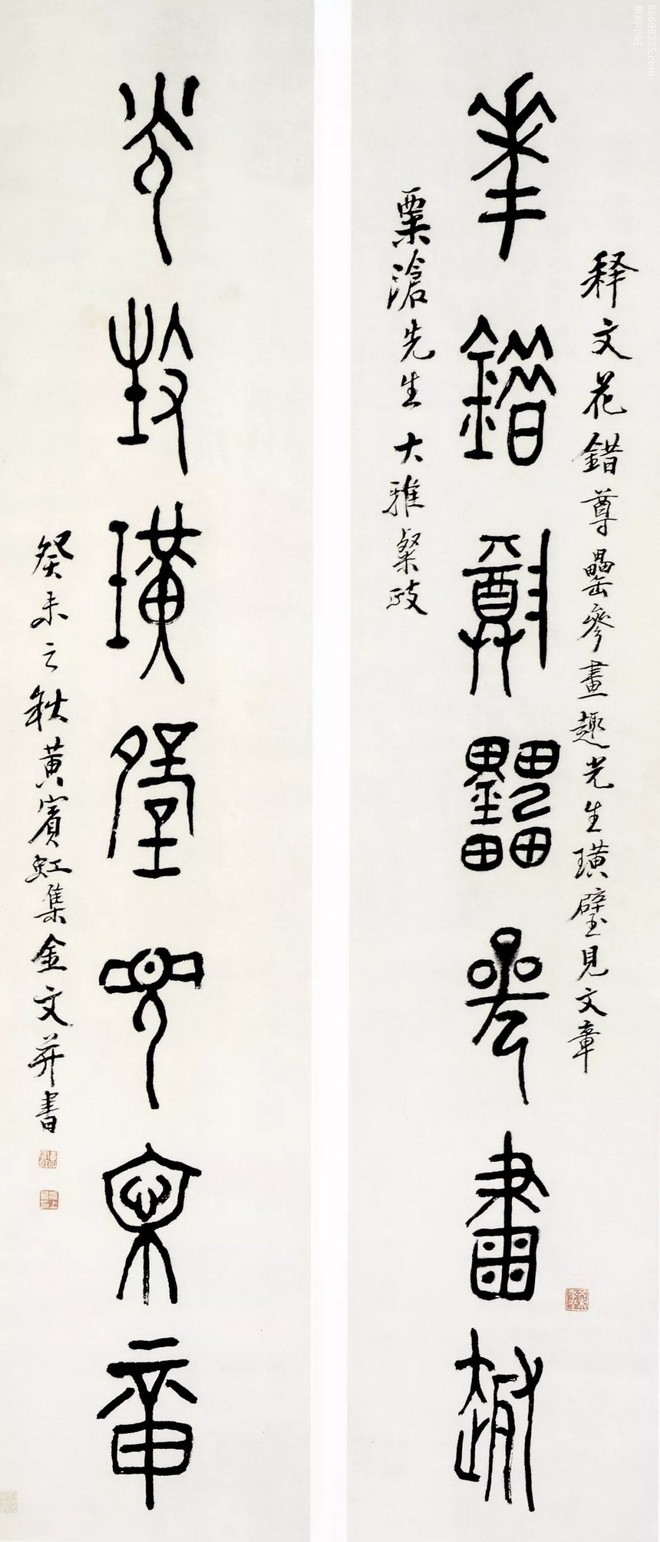 释文:花错尊罍参画趣 光生璜璧见文章 粟沧先生大雅粲政 癸未之秋 黄宾虹集金文并书