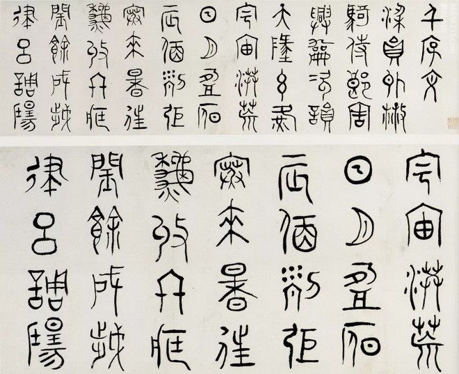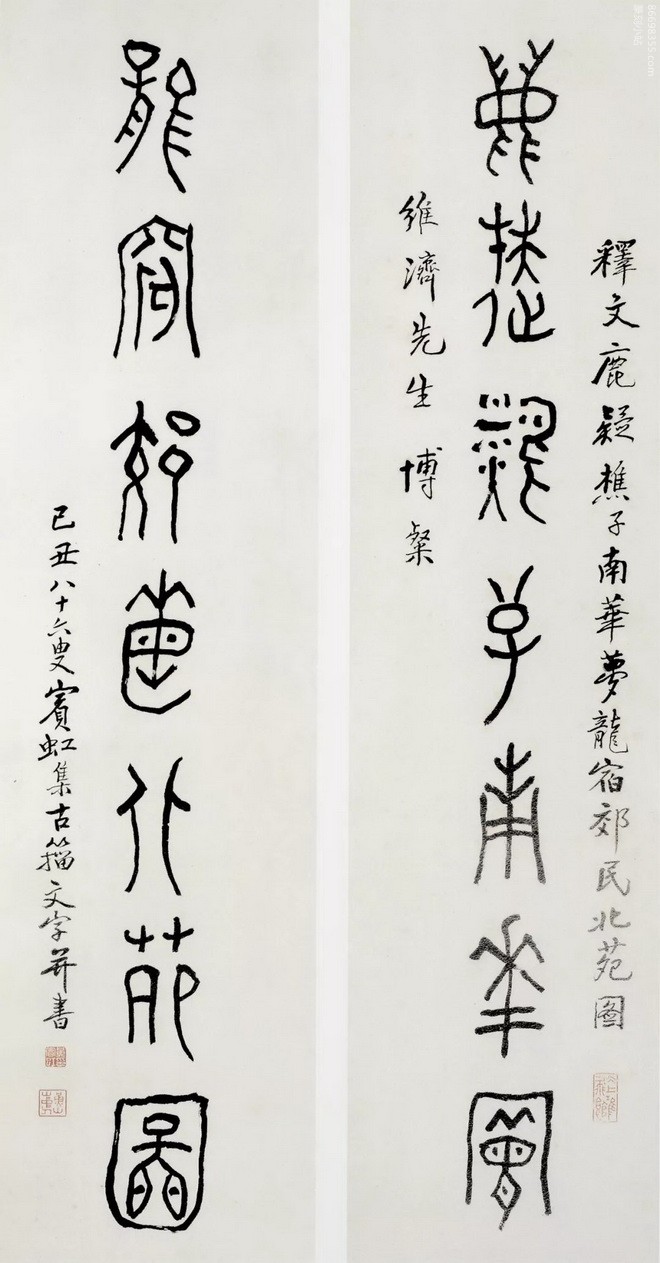 释文:鹿疑樵子南华梦 龙宿郊民北苑图 维济先生博粲 己丑 八十六叟宾虹集古籀文字并书