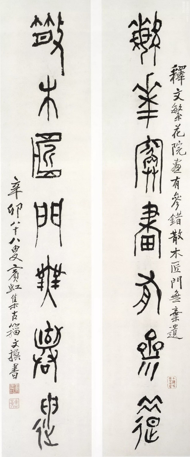 释文:繁花院画有参错 散木匠门无弃遗 辛卯 八十八叟宾虹集古籀文撰书