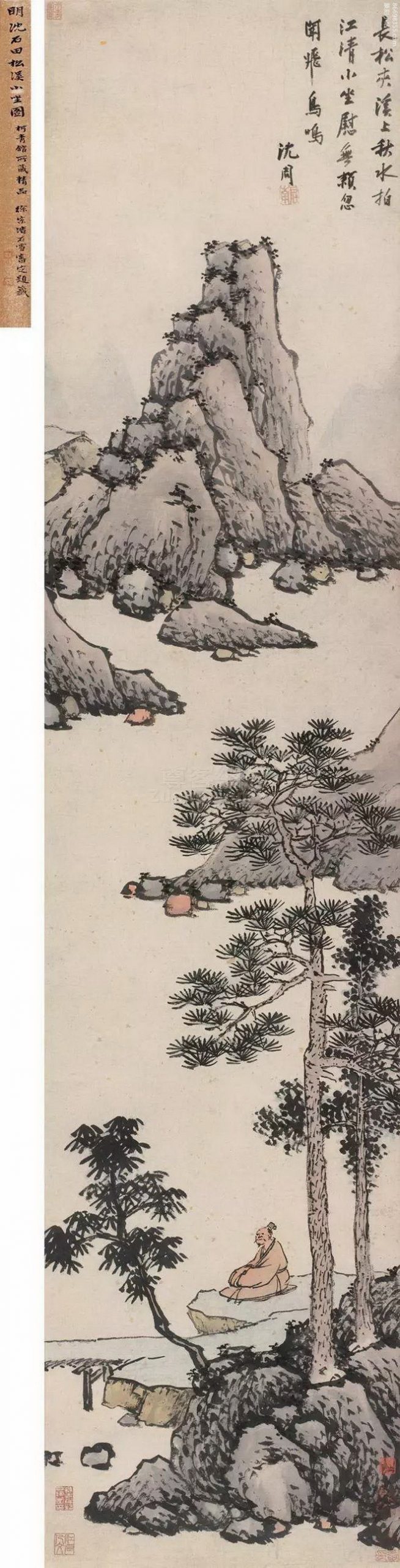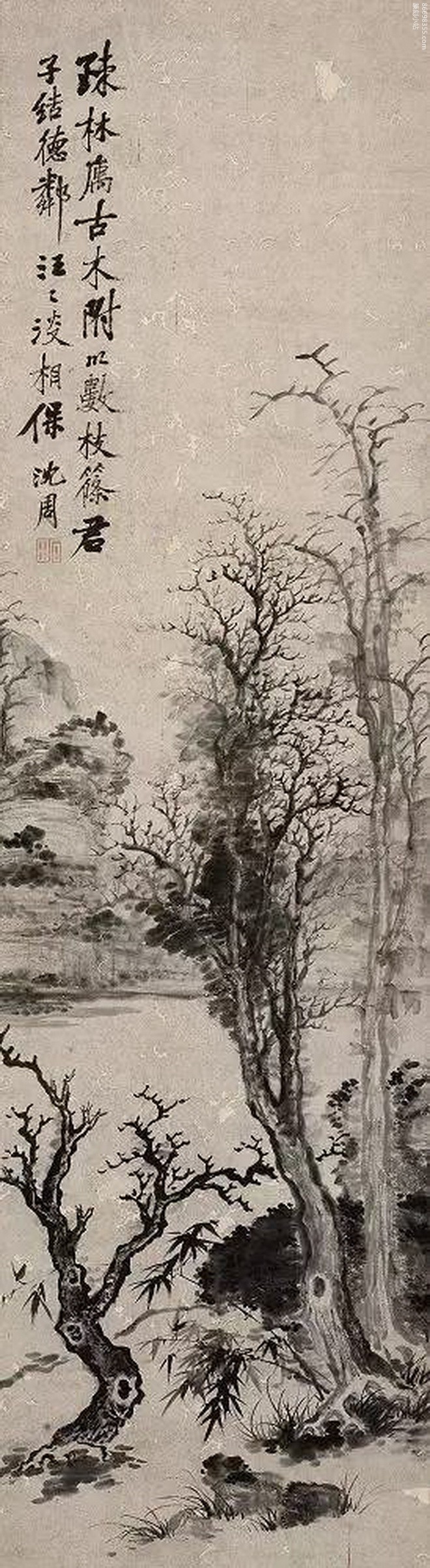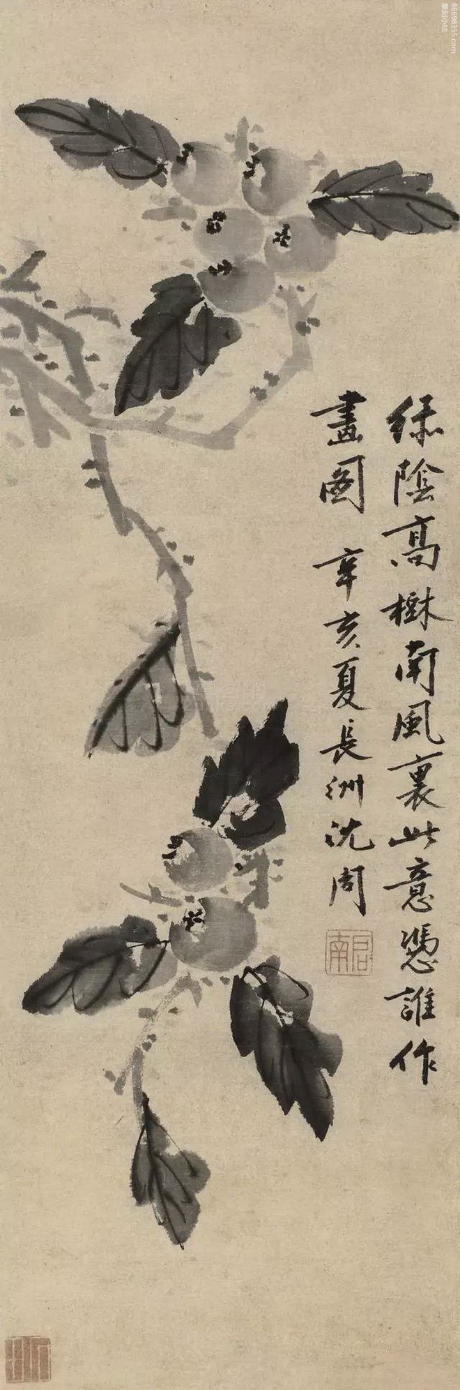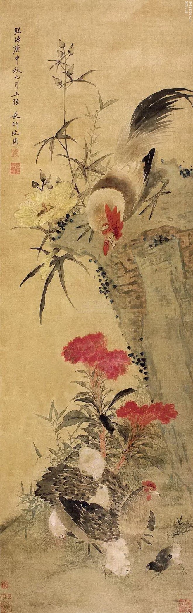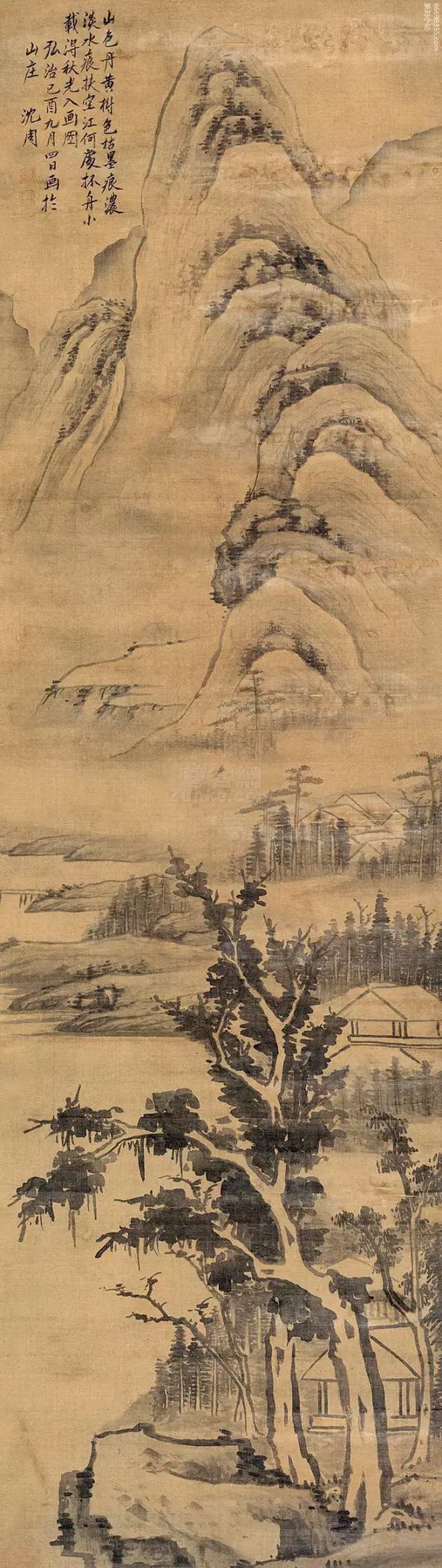 沈周(1427-1509),吴门四家之首,明代杰出书画家,江苏苏州)人。不应科举,长期以事绘画和诗文创作。擅山水,取法董源、巨然,中年以黄公望为宗,晚年醉心于吴镇。兼工花卉、鸟兽。人物,名重当时。书学黄庭坚,诗学白居易、苏轼、陆游。笔意出入变化,用笔劲捷有力,融揉参杂,具自家风貌。写意花卉鸟兽甚佳,无愧明四大画家。