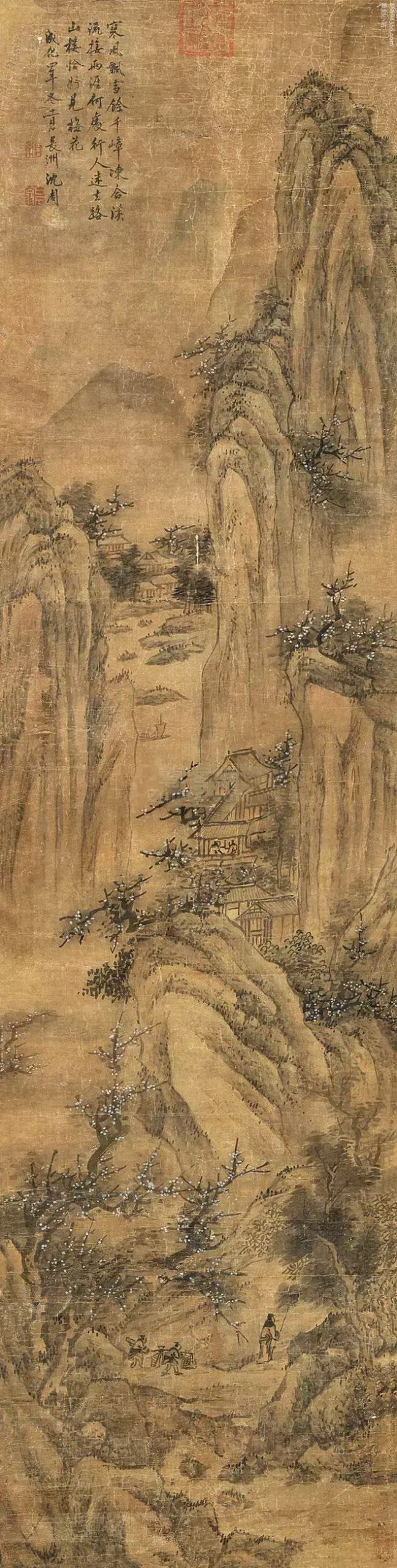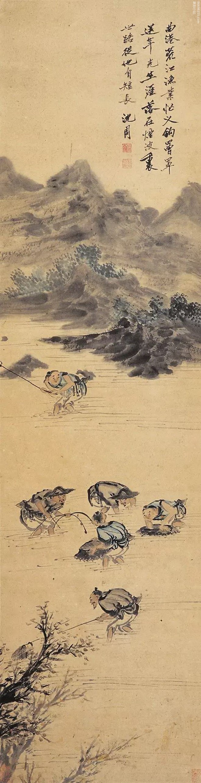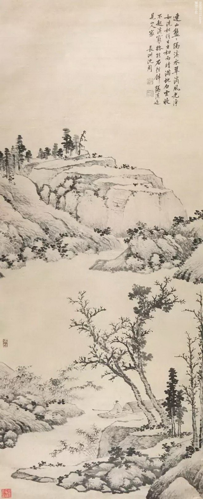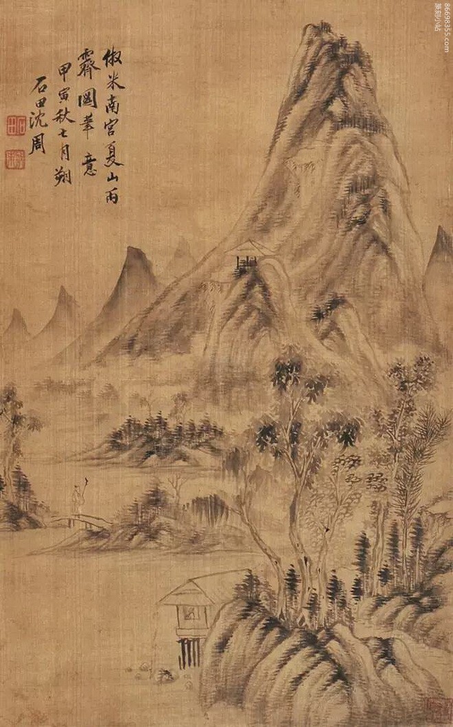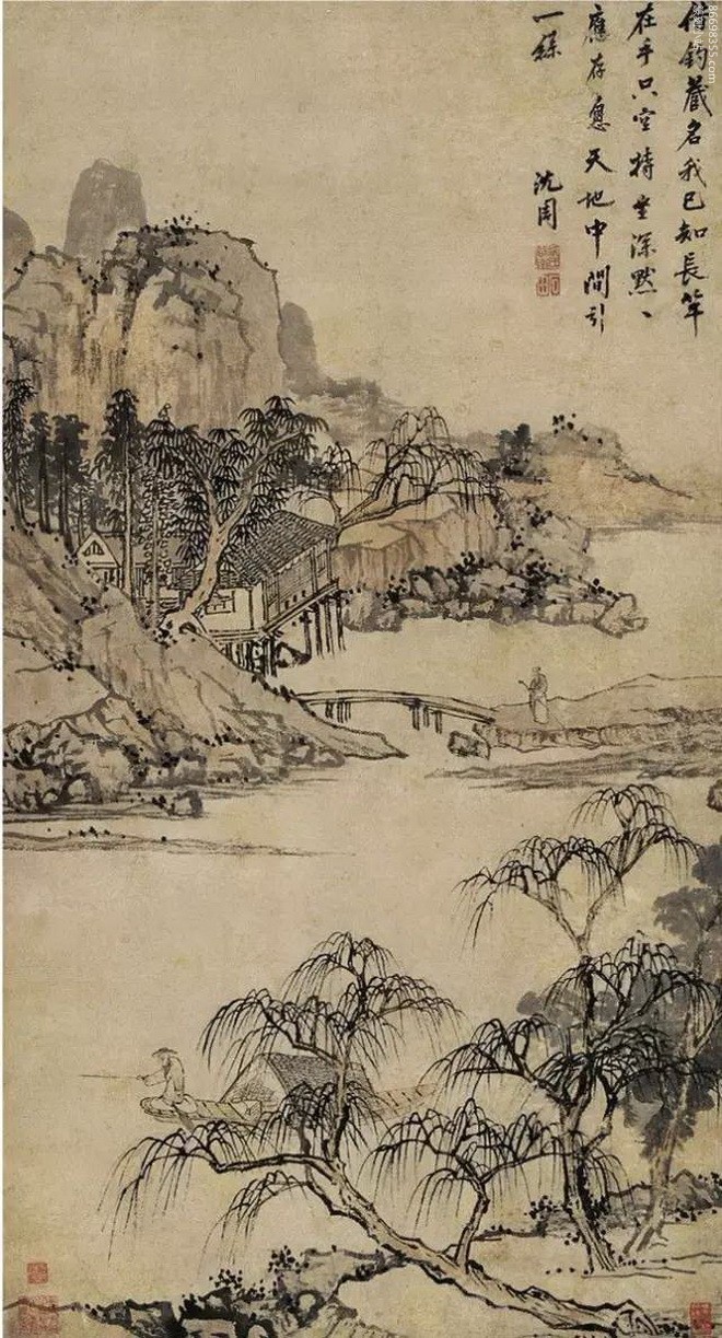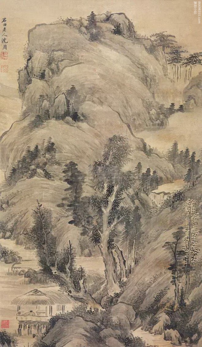 沈周(1427-1509),吴门四家之首,明代杰出书画家,江苏苏州)人。不应科举,长期以事绘画和诗文创作。擅山水,取法董源、巨然,中年以黄公望为宗,晚年醉心于吴镇。兼工花卉、鸟兽。人物,名重当时。书学黄庭坚,诗学白居易、苏轼、陆游。笔意出入变化,用笔劲捷有力,融揉参杂,具自家风貌。写意花卉鸟兽甚佳,无愧明四大画家。