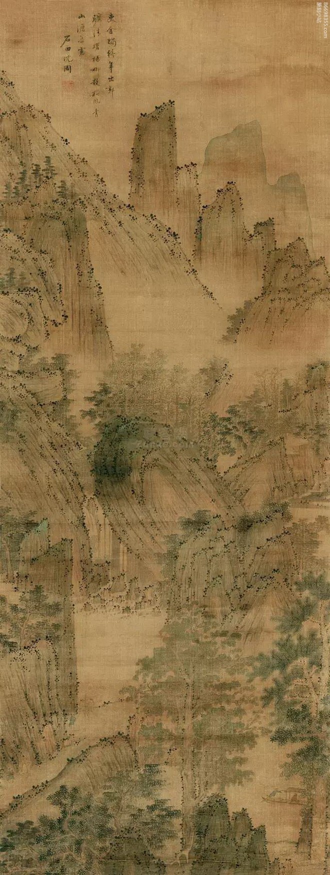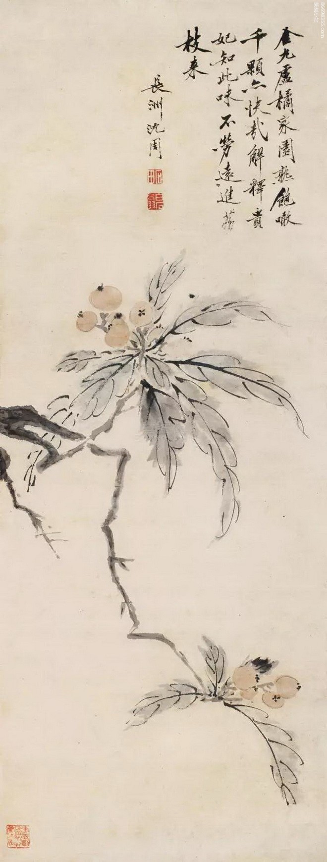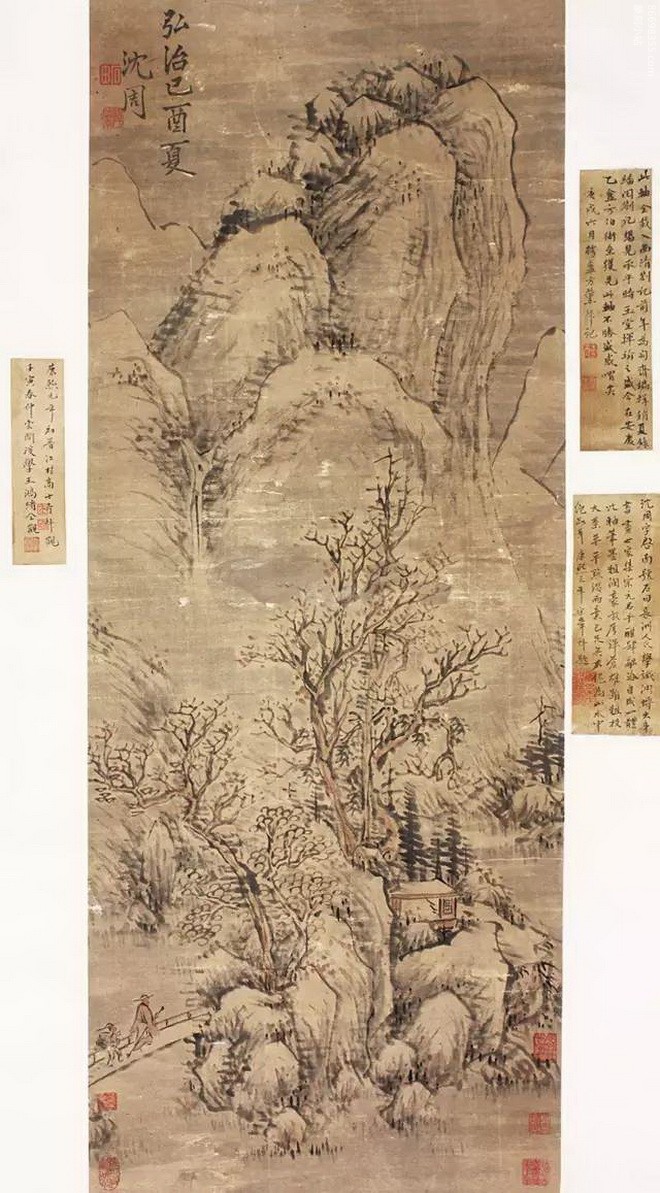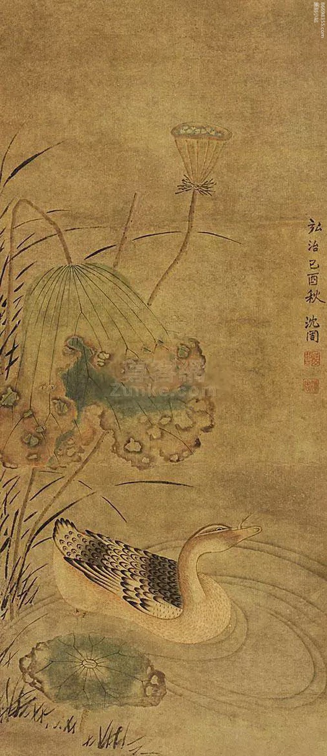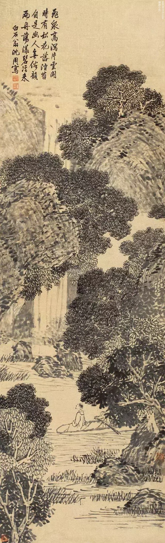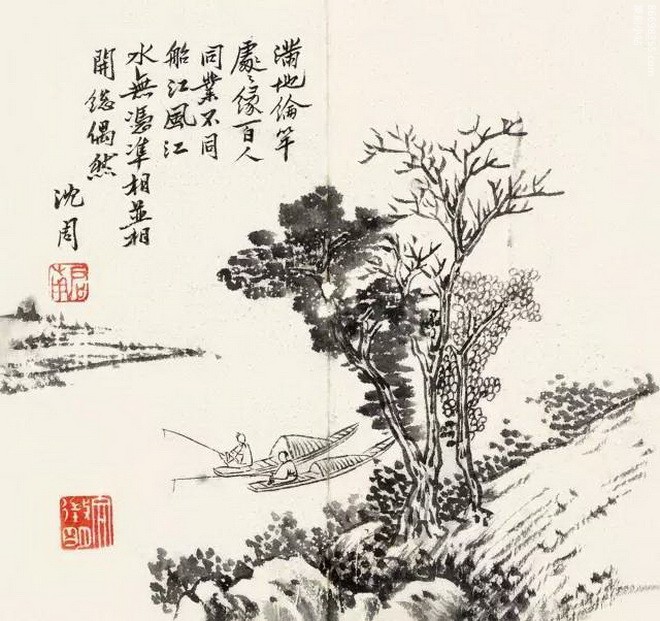 沈周(1427-1509),吴门四家之首,明代杰出书画家,江苏苏州)人。不应科举,长期以事绘画和诗文创作。擅山水,取法董源、巨然,中年以黄公望为宗,晚年醉心于吴镇。兼工花卉、鸟兽。人物,名重当时。书学黄庭坚,诗学白居易、苏轼、陆游。笔意出入变化,用笔劲捷有力,融揉参杂,具自家风貌。写意花卉鸟兽甚佳,无愧明四大画家。
