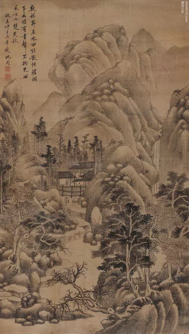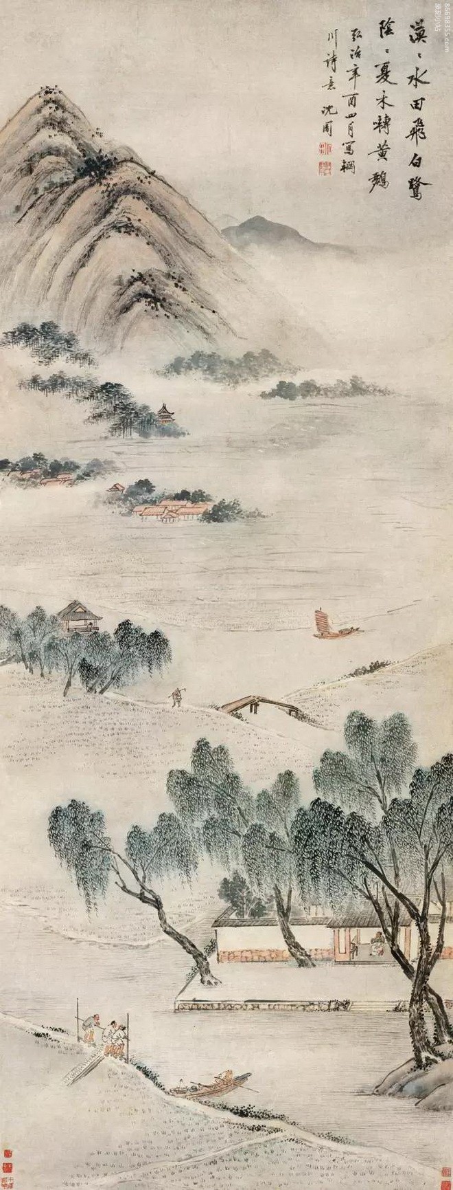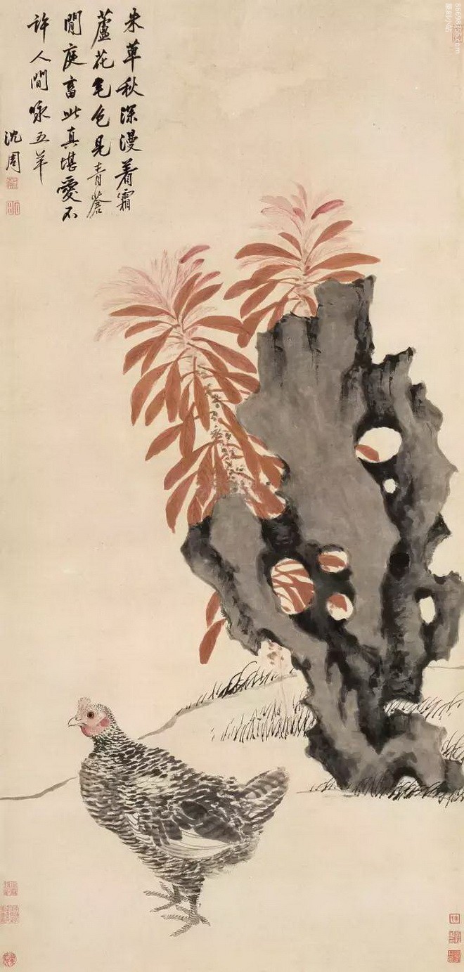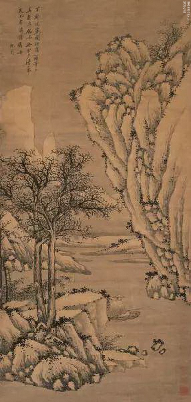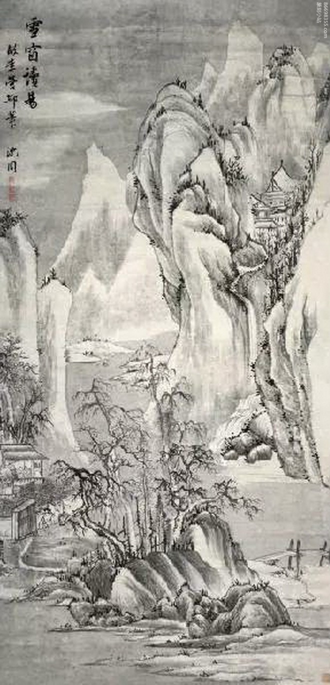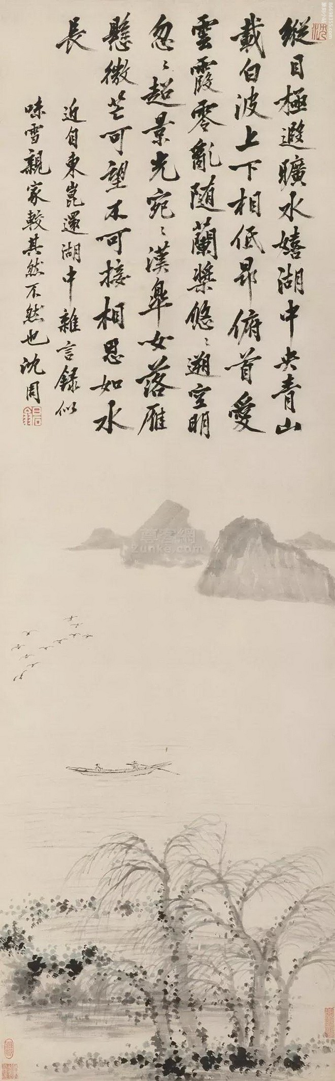 沈周(1427-1509),吴门四家之首,明代杰出书画家,江苏苏州)人。不应科举,长期以事绘画和诗文创作。擅山水,取法董源、巨然,中年以黄公望为宗,晚年醉心于吴镇。兼工花卉、鸟兽。人物,名重当时。书学黄庭坚,诗学白居易、苏轼、陆游。笔意出入变化,用笔劲捷有力,融揉参杂,具自家风貌。写意花卉鸟兽甚佳,无愧明四大画家。