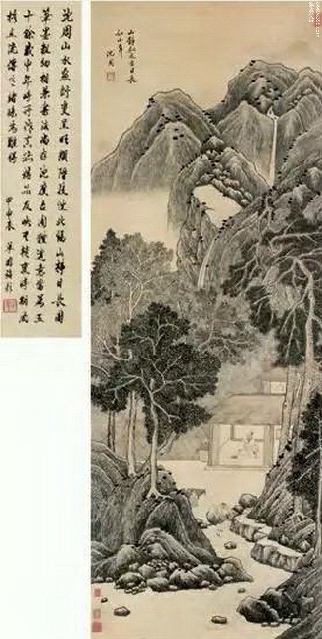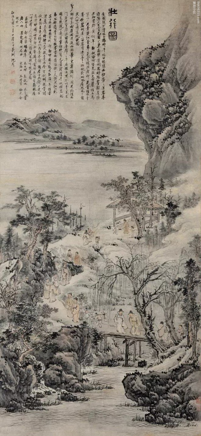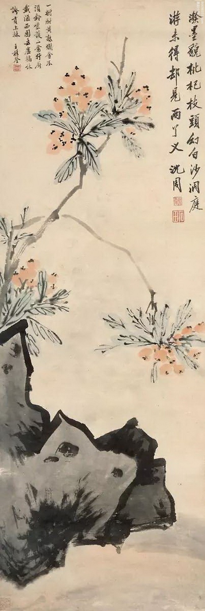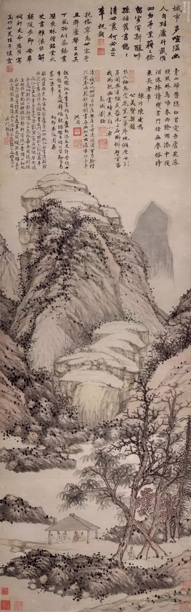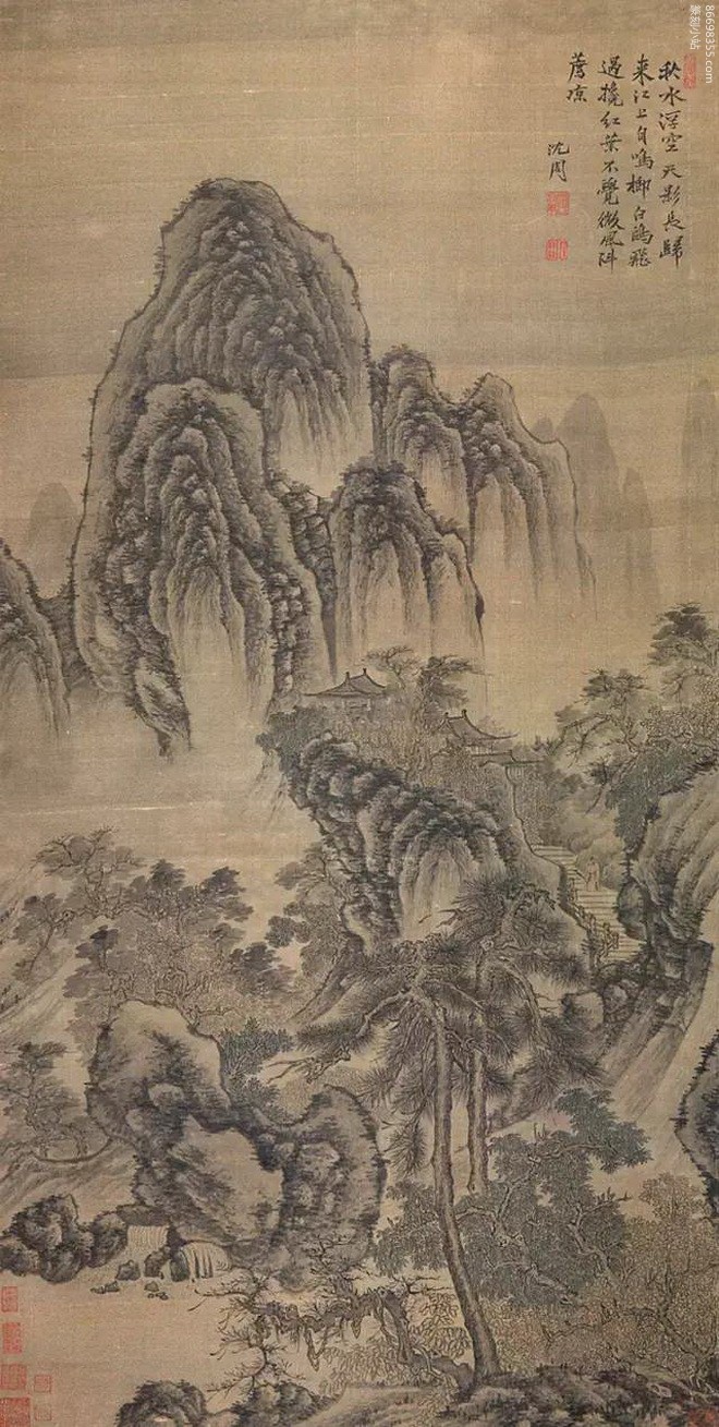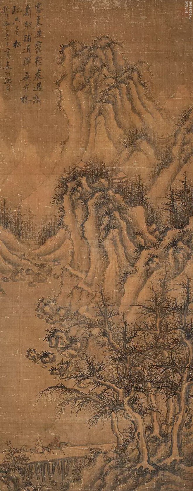 沈周(1427-1509),吴门四家之首,明代杰出书画家,江苏苏州)人。不应科举,长期以事绘画和诗文创作。擅山水,取法董源、巨然,中年以黄公望为宗,晚年醉心于吴镇。兼工花卉、鸟兽。人物,名重当时。书学黄庭坚,诗学白居易、苏轼、陆游。笔意出入变化,用笔劲捷有力,融揉参杂,具自家风貌。写意花卉鸟兽甚佳,无愧明四大画家。