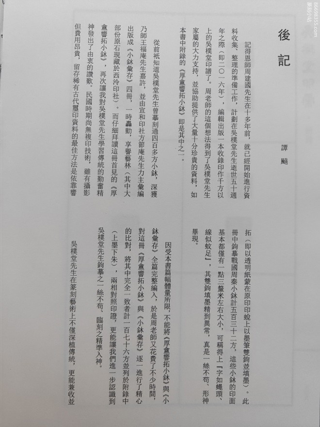 下真迹一等,吴朴堂篆刻精选1000方边款逾200面,原色 选录了吴朴堂先生各阶段的篆刻印蜕逾千枚、边款逾二百面,大部份是首次出版发行的作品,收录印作数量上远超之前所出版的各类吴朴堂先生印谱。篆刻小站推荐。 吴朴堂印汇,周建国 谭䬅 编,16开356页,重庆出版社出版,精装书匣套装,定价268元,。采用“下真迹一等”的原色印刷,力求限度真实全面地展现出吴朴堂先生的篆刻面貌。按照“诗词闲句”“书画鉴藏”“名号斋馆”和“附录”分类顺序排版,以方便读者检索查阅。 印谱.教程.技法 - 分享 加微信获取:wenbaozhai365