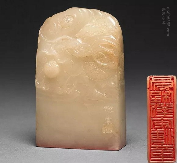 寿山白芙蓉随形扁章,质地洁净通透,印身浅浮雕刻海水云龙,正面见一龙自云中飞下,正在追逐火珠,四周云雾缭绕,龙身时隐时现,背面下方则为海水仙山。构图疏密得宜,雕工精致,龙头、鳞片及云雾海水的线条刻画尤其细腻。印面为近代篆刻名家吴朴堂(1922-1966)所刻“乌程刘安溥章”朱文,秀雅整饬,功力精深。
