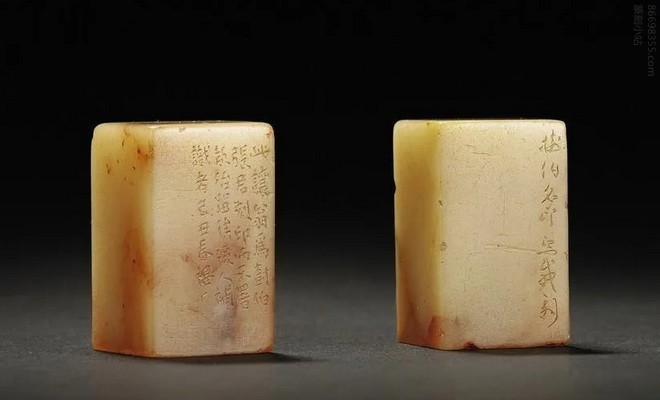 清吴让之刻寿山石张树伯自用对章,印文:张文梓印,树伯;印面尺寸:2.1×2.1厘米,高3.5厘米,西泠印社2013年春季拍卖会,晚清四大家篆刻专场,成交价105.8万。