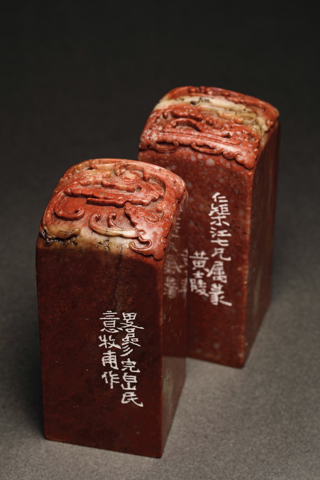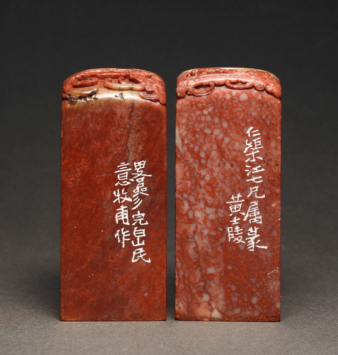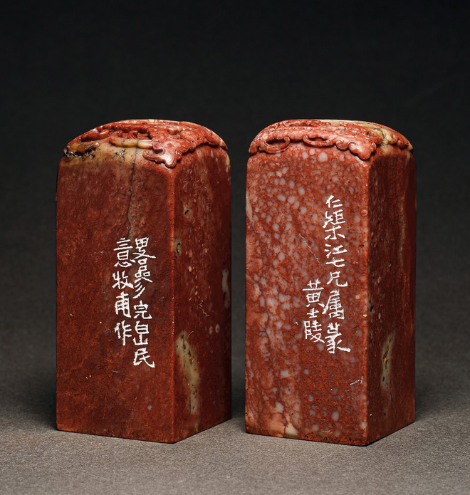 黄士陵刻寿山石博古钮对章,印文:仁举江七,季昭长年;印面尺寸:4.5×4.5厘米,高10.7厘米,中国嘉德2022年春季拍卖会,清宁—金石篆刻艺术,成交价格172.5万。