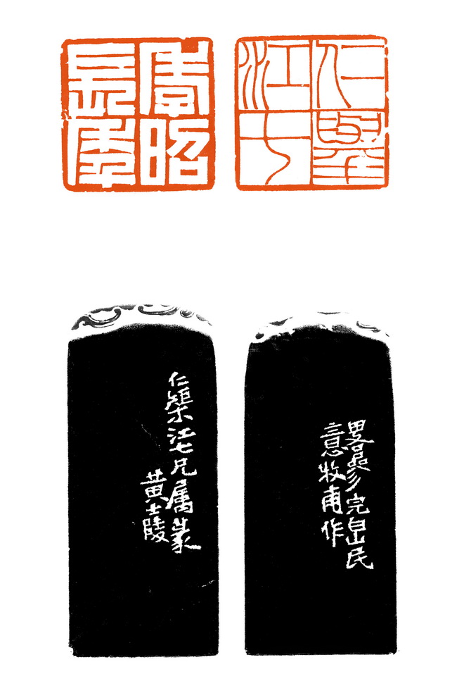 “季昭长年”“仁举江七”朱白文对章当是其篆刻代表作品之一,“季昭长年”白文印融邓完白与汉铸印于一炉,刚毅豪迈中有明朗清新的气息;“仁举江七”朱文印以十字界格均分印面,文字婀娜,刀法稳狠,是黟山印风的典型表达。