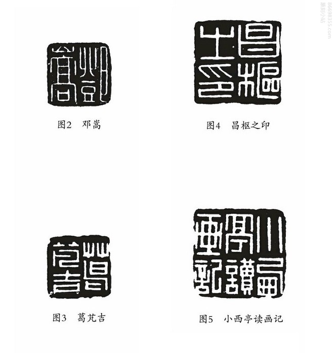 胡䦆在篆刻技法上有许多迥异时趣的特色。从作品中分析,胡的细白文仿汉玉印有以下特征:一、字法朴拙。不要说奇恣或圆转,就连平正胡也不屑为之。其印文看似平匀,实则重心下沉,稳重而具拙意,在“昌枢之印”(图4)、“小西亭读画记”(图5)中尤为突出。在字的结构上也有同样的倾向,如“昌枢之印”每个字均取拙避巧,气韵古穆。二、章法沉着简远。与布篆重心下沉类似,胡整方印的重心也往往偏下,与“印从书出”一路印人的让头舒足是截然相反的。造成这种局面一方面有其布篆的影响,如“小西亭读画记”一印;另一方面也有其刻意的处理,如“小西亭读画记”印下三字笔画繁但占地少,且下边薄而残出。重心下沉往往损及作品的神采,而胡敢于用险,得舒缓浑穆之气。字与字间距疏朗看似单纯,实则正是其篆刻的用心之处,表面朴实简远,实则微妙细致,如“昌枢之印”。三、线条挺拔雅洁。胡善用冲刀,但一些长直笔的刀韵却有平刀直切的效果。他用刀起收从不出锋,但转折处却很方挺,所以其线条润泽而不失劲健。四、印边古朴自然。胡的细白文线条挺劲而印边古拙,很少有不残边的,这也是其塑造朴拙印风的重要一环。