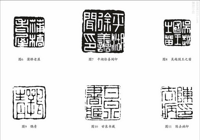 胡䦆的朱文印取法汉晋铸印,线条较粗,凝重浑厚,古雅朴拙,也是极具特色的(图9~图11)。从朱白统一的角度看,由他朱文印的风格也可以从侧面了解其白文的朴拙浑穆乃是其审美追求。