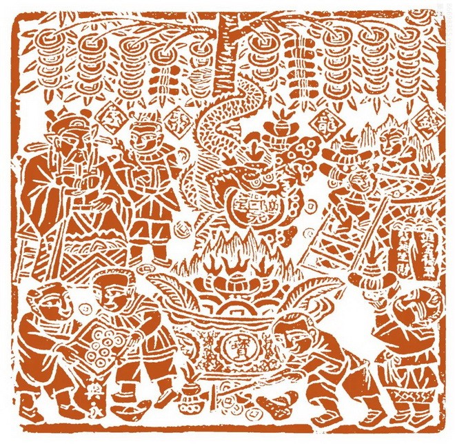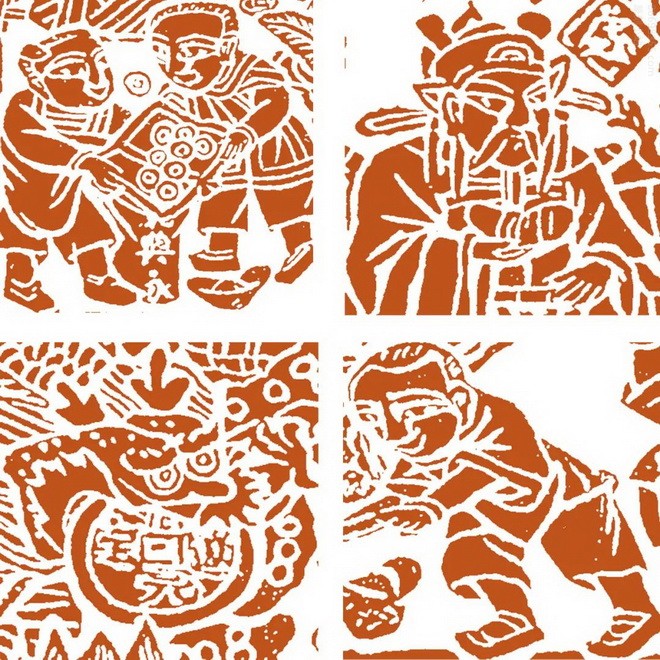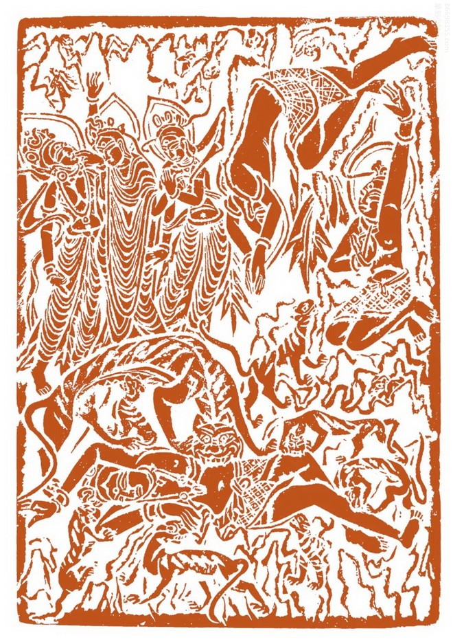 叶青峰将这则故事以篆刻的方式再现,右上角萨埵那太子纵身一跃,饱含悲怆与崇高的情怀,而首尾又连接起誓救虎与崖下被虎啃食两组场景,成为画面中精彩的局部之一。