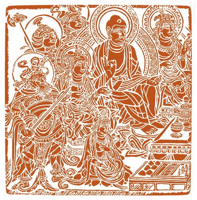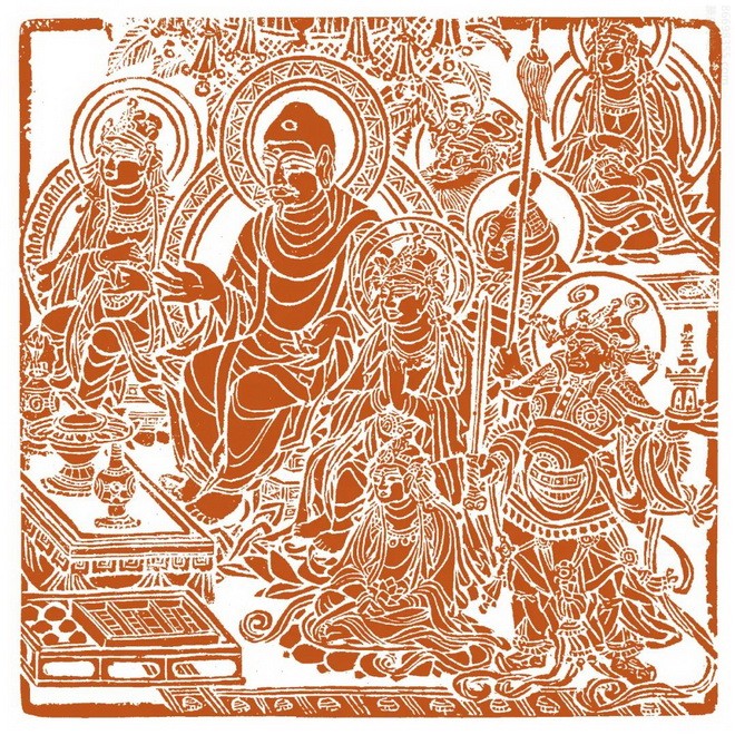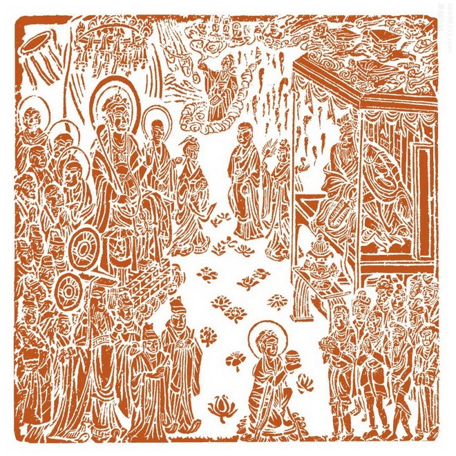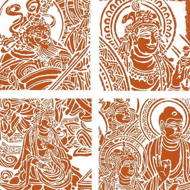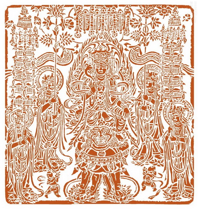 篆刻中经变人物繁多、规模浩大,以俯视视角观此场景。主要形象在取法盛唐的基础上,以阴阳刻法归纳总结线条排布,保留形神,达到壁画造像与刻凿造像的微型统一。