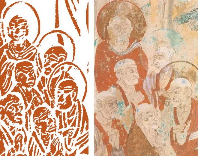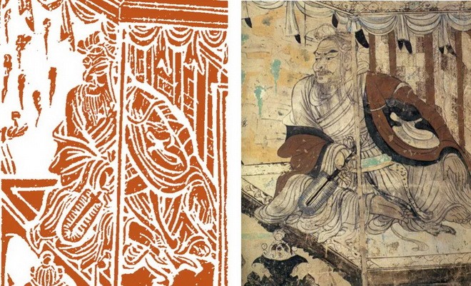 此维摩诘形象为盛唐时期人物画技法飞跃式提升的图像印证,被认为是属于吴道子一派的绘画风格。画中维摩诘手执麈尾坐于胡床之上,身子前倾,凝神聚思。落笔刚健,线描为主,衣纹似有一气呵成之流畅感。
