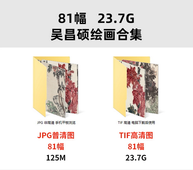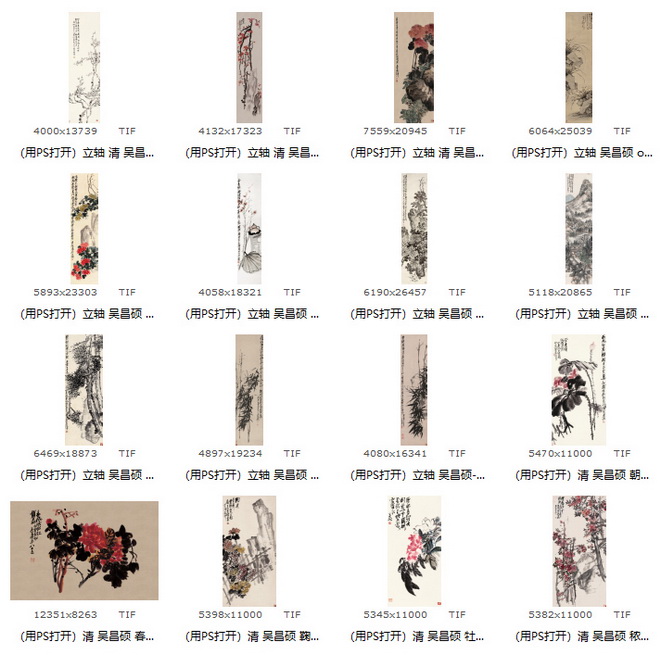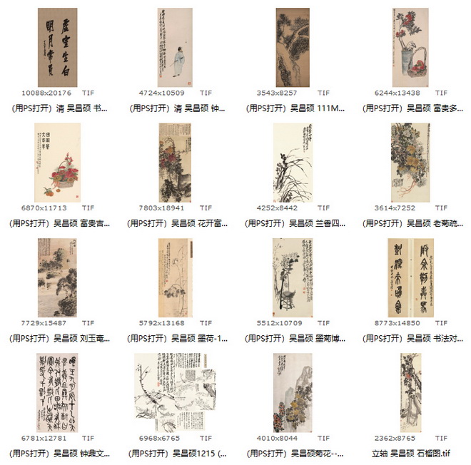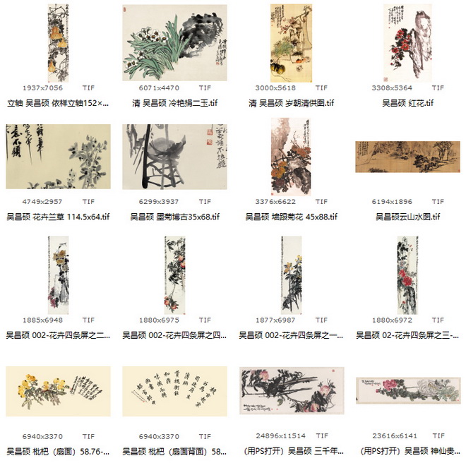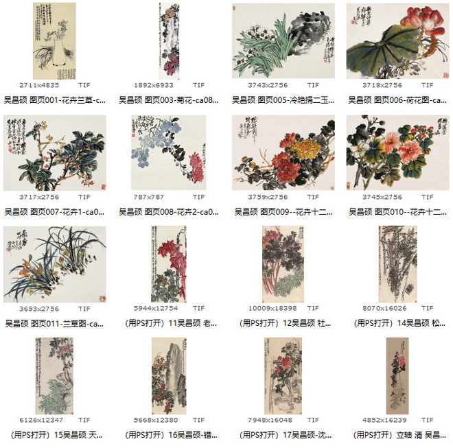 吴昌硕绘画合集,山水花鸟人物篆书等,高清电子版下载 吴昌硕绘画合集,TIF+JPG源文件,素材大小23.7GB。内容有吴昌硕老少年轴,牡丹水仙轴、松梅图,天竹水仙轴、错落珊瑚枝图、沈香亭牡丹图、贵寿图、墨梅、霞气图、写意花卉图、菊花图、梅花图、石榴图、松树图、竹石图、朝日红荷图、春风吹出红图、钟馗、岁朝清供图、富贵多子寿、富贵吉祥、花开富贵图、兰香四时图、墨菊博古图、琵琶扇面图等。 印谱.教程.技法 - 分享 加微信获取:wenbaozhai365
