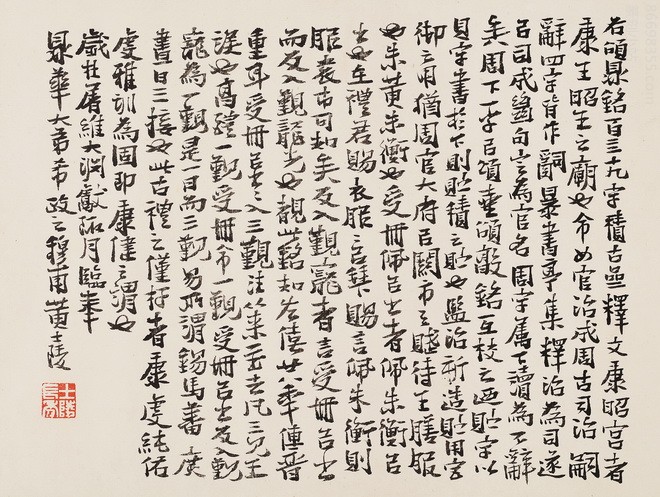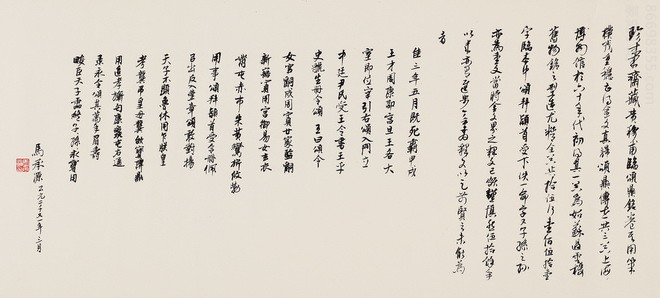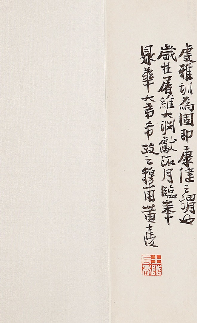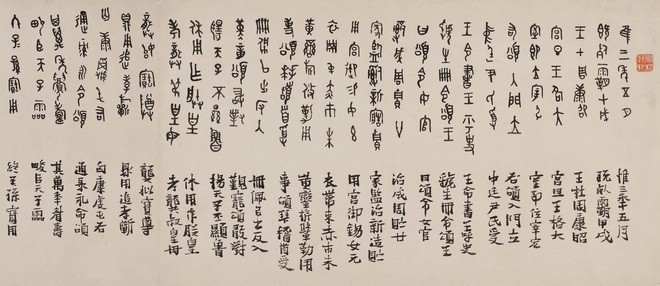 黄士陵临西周颂鼎铭文手卷,作于1899年正月,是年黄士陵51岁,黄士陵临书之下并注楷书释文,再作考跋云:“右颂鼎铭百四十九,积古斋释文,康昭宫者康王昭王之庙也……”接着著名考古学家、古文字学家、文物鉴定专家、原上海博物馆馆长马承源先生于2001年3月作跋曰:“珍秦斋藏黄穆甫临颂鼎鼎铭卷,其用笔朴茂重稳,甚得金文真谛。颂鼎传世共三器,上海博物馆於六十年代初得其一器,为姑苏过云楼旧物……”传世金石书画之珍在于作品的艺术表现力及作品丰富的文化内涵,在于作品的流传有绪,在于作品鉴赏递藏过程中文士的考跋记录痕迹。此黄士陵临西周颂鼎铭文不仅仅是一件临摹作品,其百年前金石家对此器考释的观点对今天研究颂鼎本体及晚清金石学发展状况有着重要的意义,再者原藏珍秦斋又得马承源先生长跋,当然是精品珍本了。