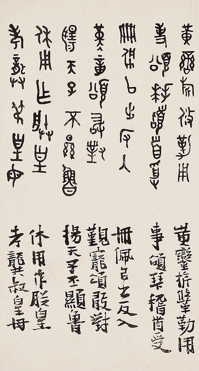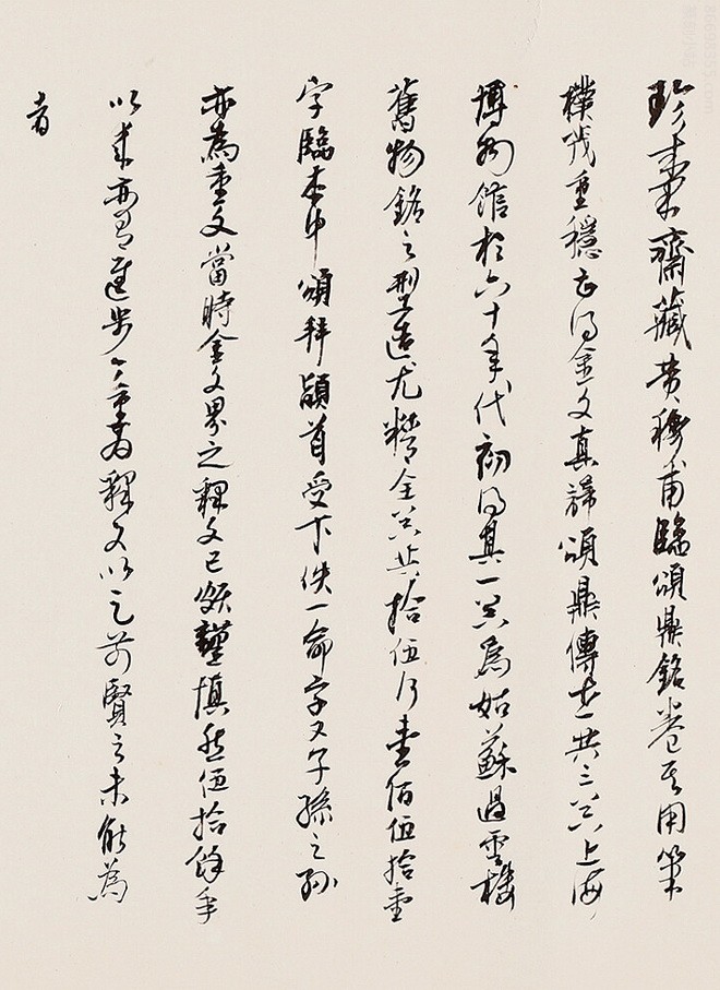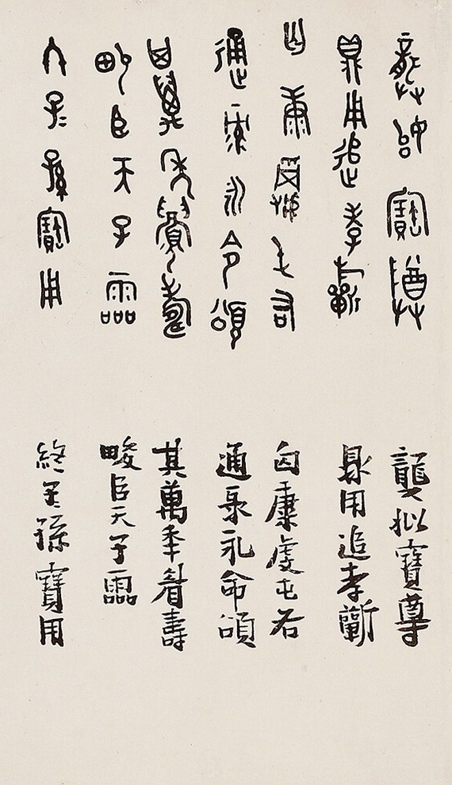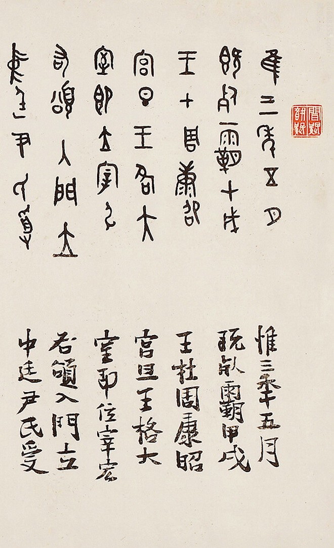 题跋:珍秦斋藏黄穆甫临颂鼎铭卷,其用笔朴茂重稳,甚得金文真谛。颂鼎传世共三器,上海博物馆于六十年代初得其一器,为姑苏过云楼旧物,铭之型造尤精,全器共拾伍行壹佰五十一字,临本中“颂拜稽首受”下佚一“命”字,又“子孙”之“孙”亦为重文,当时金文界之释文已颇谨慎,然五十余年以来亦有进步,今重为释文,以足前贤之未能为者。(释文略)。马承源,公元两千又一年三月。
