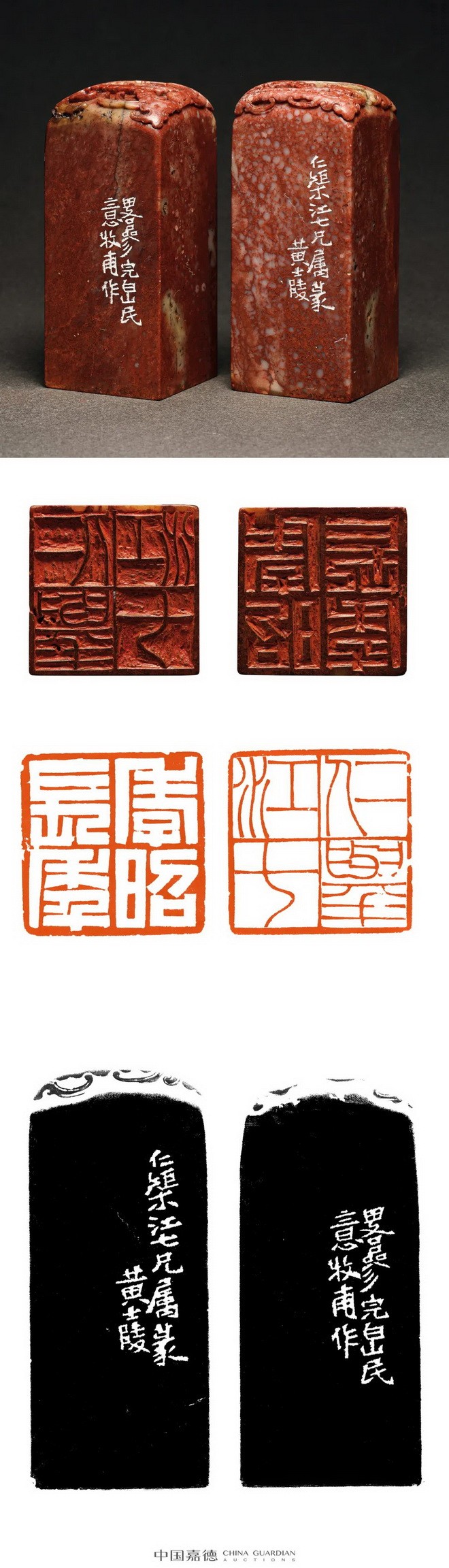 Lot 4279 黄士陵刻“仁举江七季昭长年”寿山石博古钮对章;印文:1、仁举江七。2、季昭长年。边款:1、略参完白山民意,牧甫作。2、仁榘江七兄属篆,黄士陵。尺寸:4.5×4.5×10.7 cm×2;