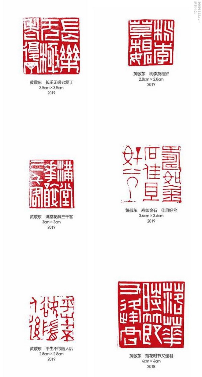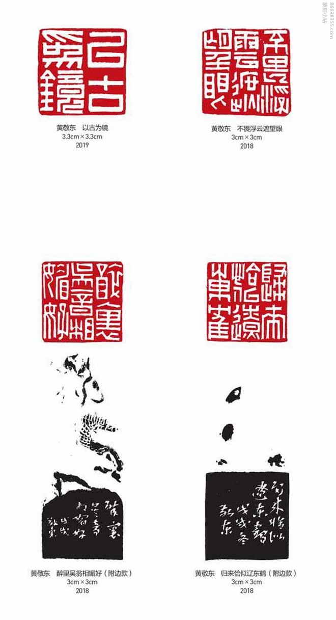 黄敬东先生的作品先后入展中国书协主办的兰亭奖、全国展等30余次,15次入届西泠印社展并获奖,多次在中国煤矿书协主办的展览中获奖。印宗秦汉、入古出新,是黄敬东对篆刻艺术一贯的追求。他广采博取,简约提炼,最终形成了以汉印与古玺为其主要面目的创作特点,他深知,过于四平八稳,循规蹈矩,只知传承,不知出新,纵然奏刀千遍,最终也会流于僵化刻板的境地;当然也不能刻意去追求一种支离破碎的所谓“写意效果”。对这两种倾向,他都有所警觉并有着清醒的认识。