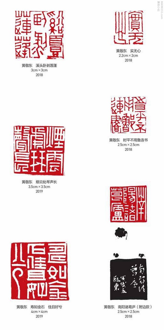 黄敬东的篆刻以“简、减、静、厚、生”五字诀为创作理念,运用之妙,存乎一心。黄敬东的作品大多为“不激不厉”“不温不火”的平正工稳之作,正切合了他所理解的微言大义,可以说内容与形式得到了完美的结合。白居易诗云“无论海角与天涯,大抵心安即是家”,苏东坡词中也有“此心安处是吾乡”的句子,都表现了一种豁达乐观、超然物外的人生态度。而对黄敬东而言,“此心安处”即精神游走在刀笔之间,是一种“独与天地往来”的洒脱,其心灵的故乡即在气象万千的方寸之内,游目畅怀自可乐,精骛八极接天载。