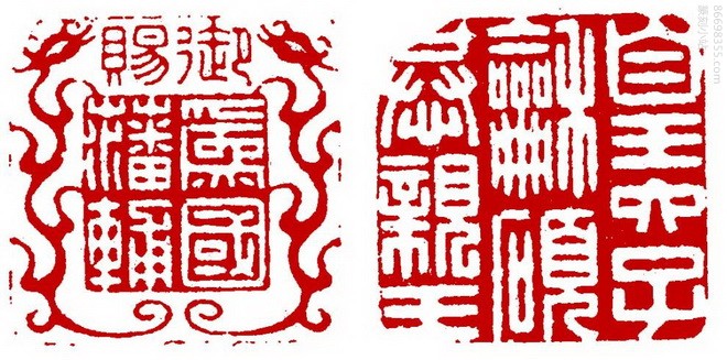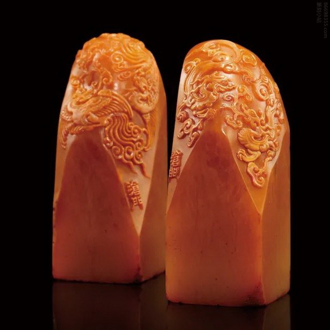 董沧门刻恭亲王龙凤田黄对章 龙章印文:“皇六子和硕恭亲王”;凤章印文:“御赐为国藩辅”
