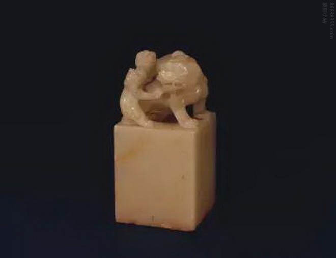 “圆明主人”玺,清雍正,寿山石质,狮纽方形玺,汉文篆书。面3.8cm见方,通高7.7cm,纽高3cm。