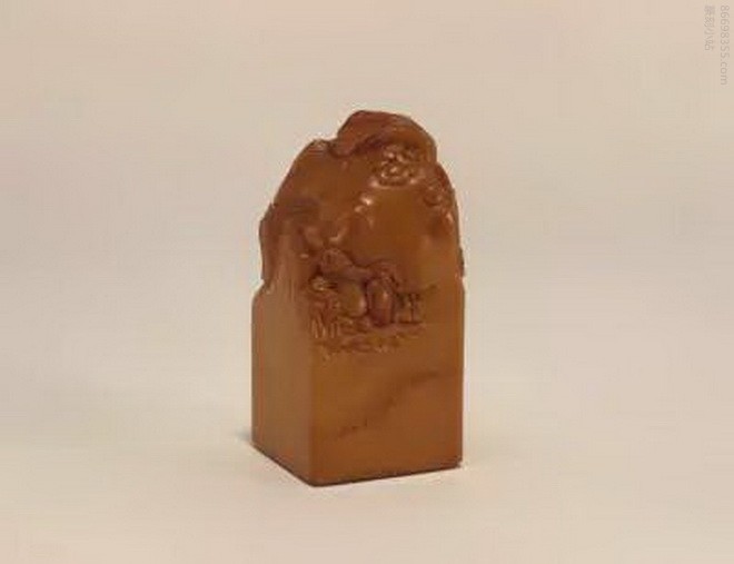 “万国咸宁”玺,清雍正,寿山石质,随形雕山水人物方形玺,汉文篆书。面3.3cm见方,通高7cm。
