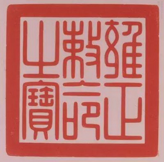 此宝制作于雍正元年(1723),据《清宫内务府造办处活计档》记载:雍正元年“正月二十三日,怡亲王交四喜桥梁钮寿山石图书一方,奉旨:改做夔龙式,镌‘雍正御览之宝’。钦此。于四月十九日四喜桥梁钮寿山石图书一方,改做夔龙,镌‘雍正御览之宝’完,配做锦匣,怡亲王呈进。”该宝是雍正帝继位后首批制作的御用宝玺之一。印纽按照雍正帝的意见进行了改刻,为双夔龙隔桥相戏之状,印体上部呈覆斗形,周边及纽上刻云纹地夔龙。夔龙体态丰腴遒健,细部雕琢一丝不苟,可以作为查考雍正时期寿山石印纽雕刻的范本。