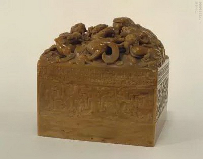 “乾隆敕命之宝”,清乾隆,寿山石质,螭纽方形玺,汉文篆书。面13.3cm见方,通高13.4cm,纽高5cm。