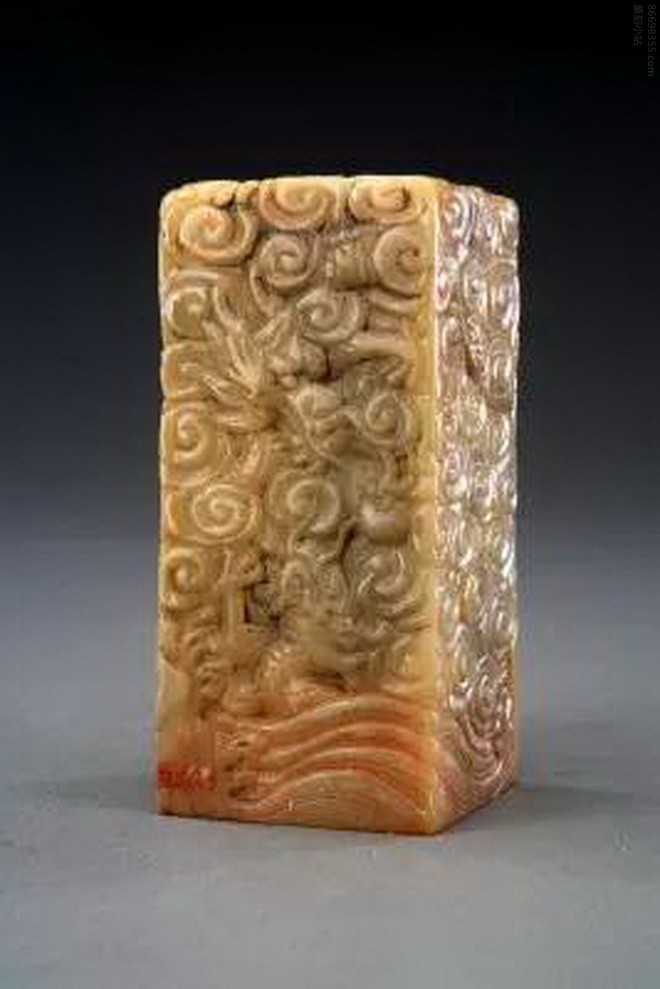 “政贵有恒”玺,清道光,寿山石质,通体雕云龙纹方形玺,汉文篆书。面4.6cm见方,通高9.9cm。