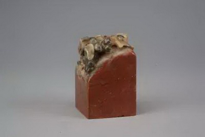 “恭俭惟德”玺,清道光,寿山石质,随形雕灵芝葡萄纽方形玺,汉文篆书。面6cm见方,通高9.5cm。