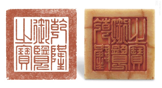 乾隆皇帝一生刻制了大量宝玺,此次苏富比上拍的“乾隆御览之宝”是乾隆皇帝众多御用鉴藏宝玺中具有代表性的一方。其材质为寿山石,印面7.8公分见方,高10.7公分,阳文篆书“乾隆御览之宝”六字,印钮部分用圆雕技法雕刻三只异兽,两只小兽匍匐在母兽身上或侧面,母兽侧首回眸,栩栩如生。据苏富比拍卖行,此玺在现藏于北京故宫的《乾隆宝薮》中有明确著录,经实物比对,无论材质、体量大小还是印文篆法布局都与书中记载相合。