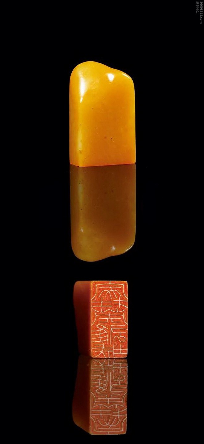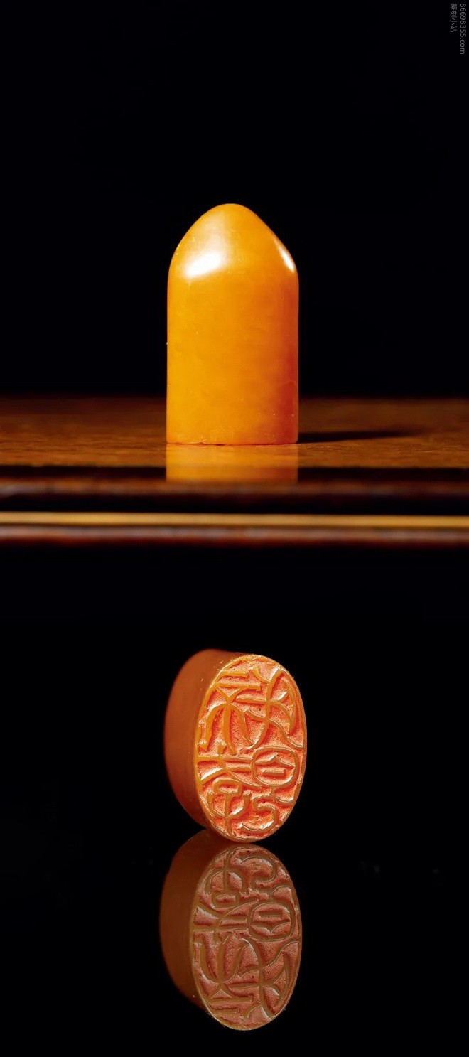 说明:此章印面椭圆,印身光素,背面略有随形,不施任何人工琢饰。颜色明亮,通体隐约呈现萝卜丝纹,似璎珞环绕,美不胜收。加之质地温润细腻,宛若凝脂,色泽雅致,沉着内敛,诚为上品。印面篆刻“不存我见”,为国民党元老钱大钧所用,常作引首章,足见其珍视。