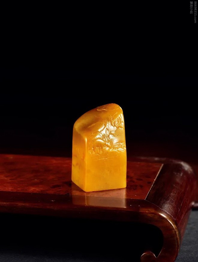 说明:此田黄石章石质细嫩,凝润灵透,十分稀见。其色泽明亮纯正,肌理之下萝卜纹绵密欲化,宝气十足,极为可人。印面扁方,印身光素,顶部略随形,无其他雕饰。印面为赵鹤琴篆刻元朱文“家在英雄城” ,印面线条流畅挺拔,诚为赵氏佳作。